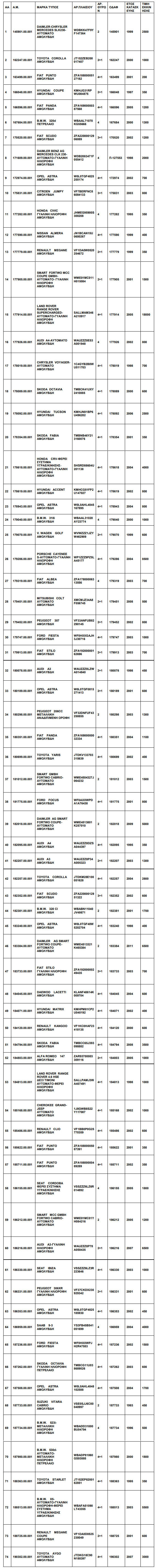Ο ΟΔΔΥ έδωσε τη δημοσιότητα τη νέα λίστα με τα αυτοκίνητα που θα διατεθούν σε δημοπρασία, η οποία θα πραγματοποιηθεί στις 05-10-2017 ημέρα Πέμπτη και ώρα 9:30 π.μ, στην αίθουσα δημοπρασιών της Αποθήκης Μαγουλέζας, στα Άνω Λιόσια (τηλ.210- 2473124 & 210-2471988).