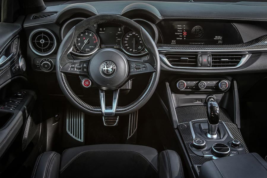 Ο εξοπλισμός της Alfa Romeo Stelvio Quadrifoglio περιλαμβάνει μεταξύ άλλων εισαγωγές αέρα στο καπό, αναδιπλούμενους εξωτερικούς καθρέφτες, ζάντες αλουμινίου 20 ιντσών, μαύρες δαγκάνες φρένων, σαλόνι σε συνδυασμό δέρματος αλκαντάρας, καθίσματα οδηγού και συνοδηγού 6 ρυθμίσεων με αφρώδες υλικό στο κέντρο, σπορ δερμάτινο τιμόνι, ταμπλό από ανθρακονήματα, έγχρωμη οθόνη 7 ιντσών, κάμερα οπισθοπορείας καθώς και περιμετρικούς αισθητήρες παρκαρίσματος.