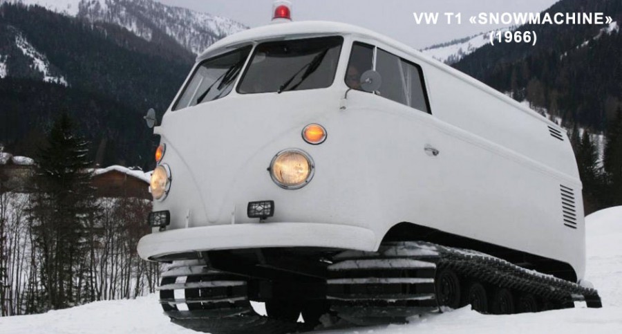 Ειδική μετατροπή ενός VW Transporter πρώτης γενιάς, το οποίο εφοδιάζεται με ένα επαγγελματικό DJ set με 2 ηχεία επί 300 Watt, αλλά και ένα subwoofer 1.000 Watt! Φυσικά, ένα τόσο ιδιαίτερο αυτοκίνητο δεν θα μπορούσε παρά να έχει και ένα ιδιαίτερο σύστημα κίνησης και έτσι αντί για τροχούς, αυτό το VW T1 φέρει ειδικές ερπύστριες χιονιού, όντας σε θέση να κινηθεί σε χιόνι και πάγο με ταχύτητες 50 χλμ./ώρα.