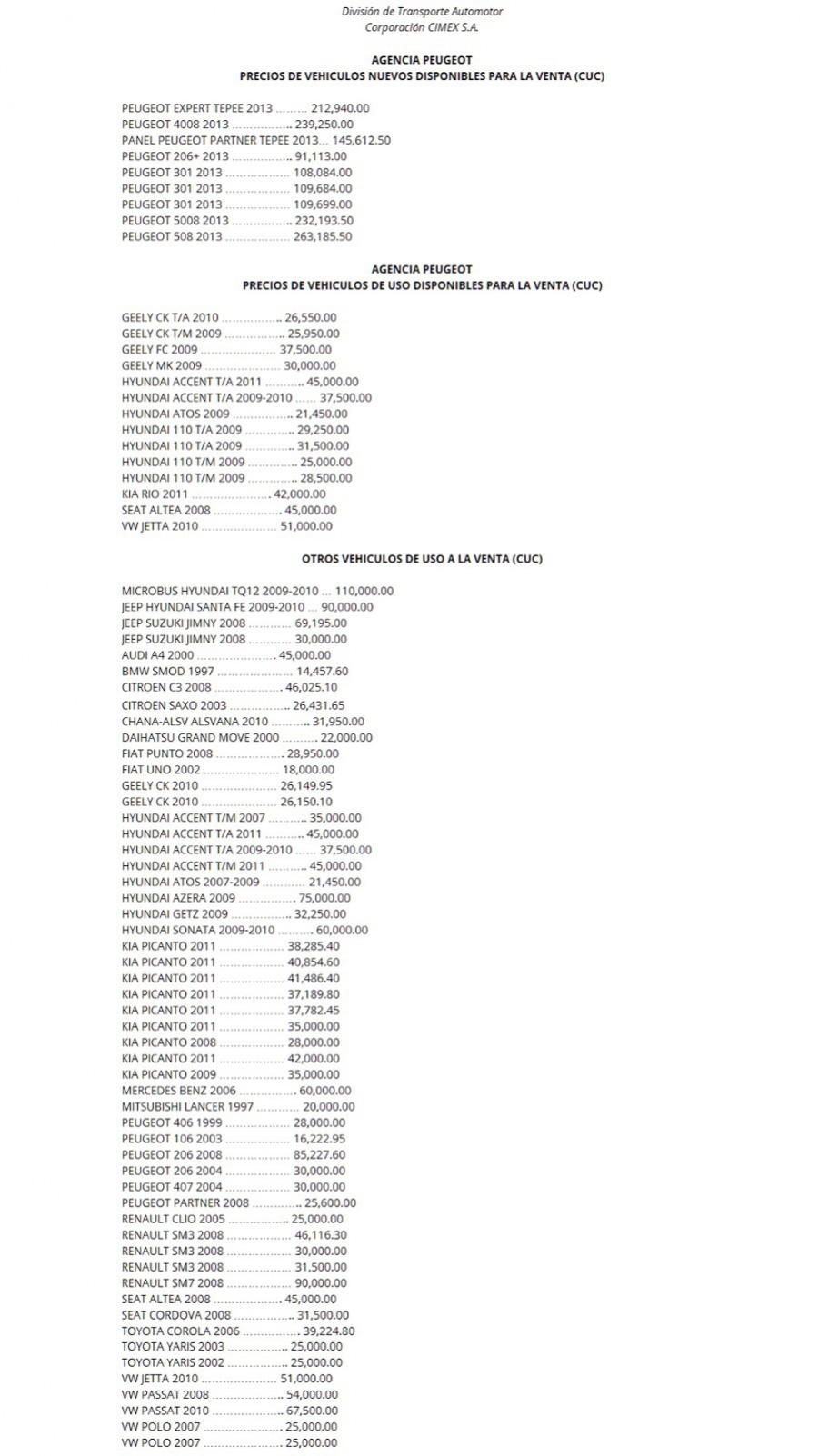 Στην φωτογραφία μπορείτε να δείτε ενδεικτικά τιμές σε καινούργια και μεταχειρισμένα αυτοκίνητα, οι οποίες αναφέρονται σε πέσο Κούβας όπου η αντιστοιχία είναι ίδια με το δολάριο των Η.Π.Α. (1 CUC = 1 USD).