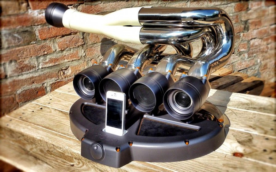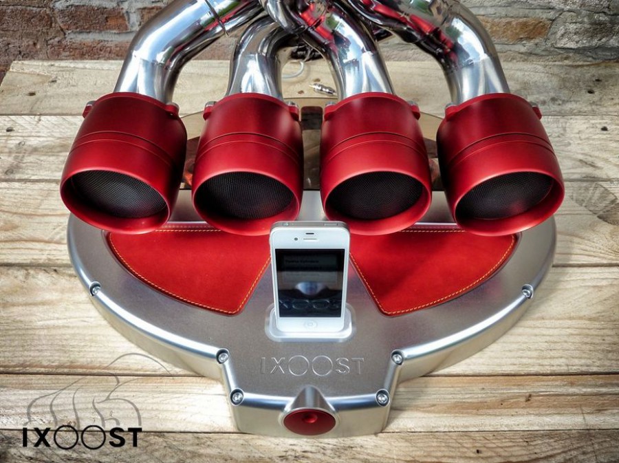H Ιταλική εταιρεία iXoost προσφέρει μοναδικές δημιουργίες dock-ηχείων ειδικά για συσκευές της Apple (iPhone και iPod), οι οποίες κατασκευάζονται από πραγματικές πολλαπλές εξατμίσεων κινητήρων, καθώς και από άλλα εξαρτήματα από εξατμίσεις αυτοκινήτων και μοτοσικλετών! Η κονσόλα-βάση έχει σχεδιαστεί για να θυμίζει στροφαλοθάλαμο μοτοσικλετών της δεκαετίας του ’60 και του ’70, ενώ τα ηχεία χρησιμοποιούν τους πραγματικούς θαλάμους της πολλαπλής και την εξάτμιση από μοτέρ με 8, 10 ή 12 κυλίνδρων υπέρ-αυτοκινήτων και αγωνιστικών κατασκευών, ύστερα βέβαια από ειδική επεξεργασία.