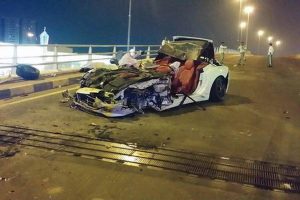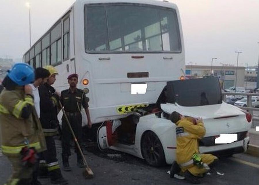 Την τύχη όλου του κόσμου με το μέρος του είχε ο μόλις 20 ετών οδηγός της εικονιζόμενης διαλυμένης Ferrari California, ο οποίος βγήκε ζωντανός από την πολύ σφοδρή αυτή σύγκρουση με το μικρό λεωφορείο. Το γεγονός αυτό έλαβε χώρα στο εμιράτο Ajman και όπως αναφέρουν μάρτυρες, ο ενθουσιώδης μικρός οδηγός έτρεχε με πάνω από 100 χλμ./ώρα σε αστικό δρόμο με κίνηση, έχασε τον έλεγχο του αυτοκινήτου, χτύπησε τέσσερα άλλα οχήματα και η τρελή πορεία του σταμάτησε πίσω από το λεωφορείο.