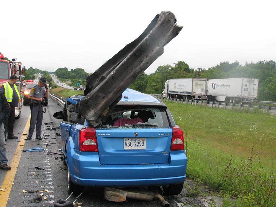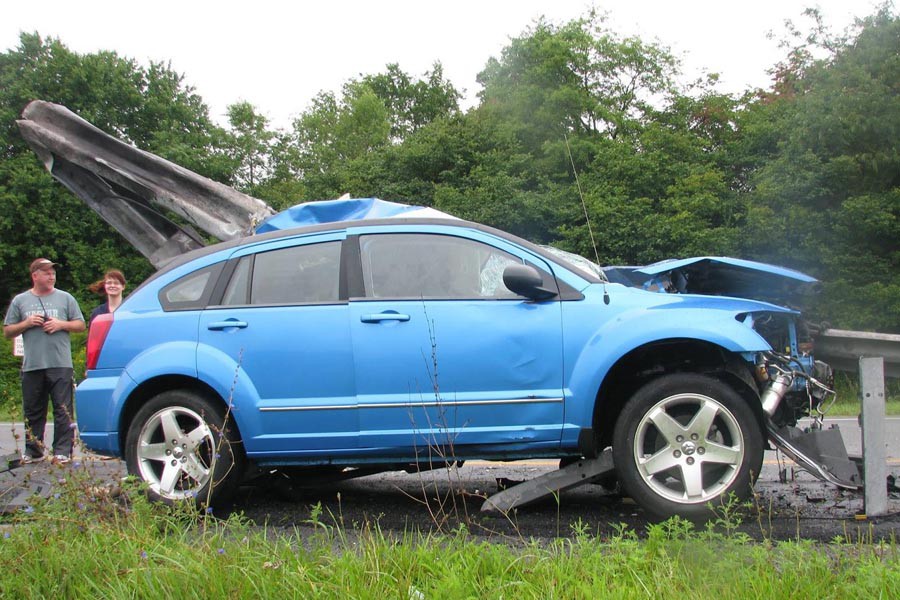 Ο οδηγός του εικονιζόμενου κατεστραμμένου Dodge Caliber κατάφερε και βγήκε ζωντανός από το τρομακτικό αυτό ατύχημα που συνέβη στη Βιρτζίνια των Η.Π.Α. Αρχικά το Caliber χτύπησε ένα ρυμουλκό τράκτορα και κατόπιν έπεσε με ορμή στα μεταλλικά προστατευτικά κιγκλιδώματα τα οποία διαπέρασαν από τη μία άκρη έως την άλλη το αυτοκίνητο περνώντας ξυστά από το προσκέφαλο του οδηγού. Ο τελευταίος δεν φορούσε ζώνη ασφαλείας και για καλή του τύχη γλίτωσε με μικροτραυματισμούς, ωστόσο για τον λόγο αυτό δεν θα λάβει αποζημίωση από την ασφαλιστική του εταιρεία.