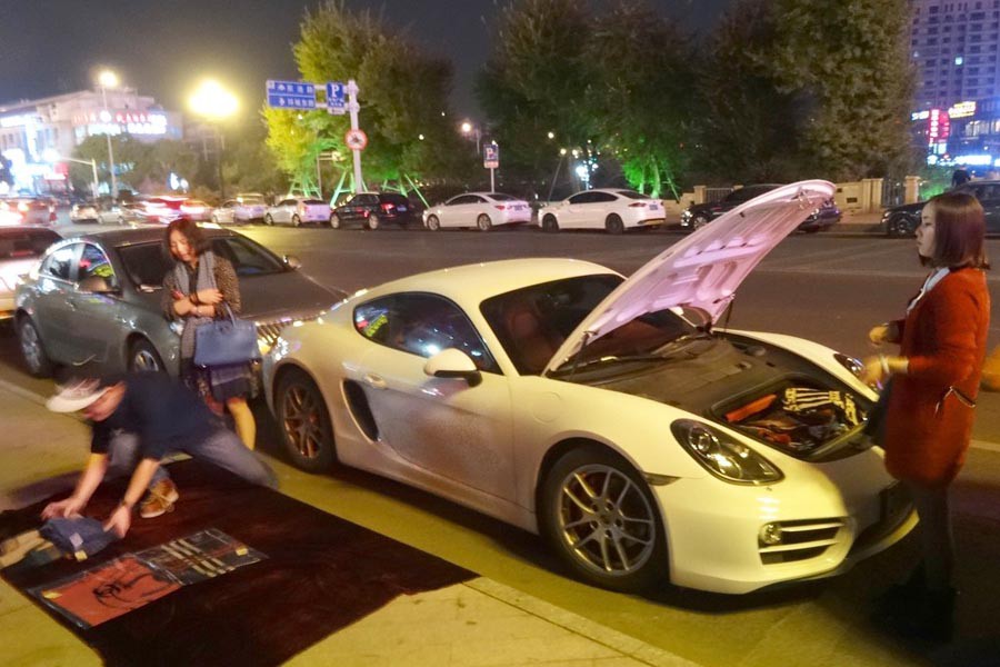 Ένας νεαρός κάτοχος μιας Cayman από την πόλη Zhejian της Ανατολικής Κίνας στον οποίο έκαναν δώρο οι γονείς την σπορ Porsche, μην έχοντας χρήματα για να βάλει βενζίνη και να πάει βόλτα την φίλη του αναγκάστηκε να στήσει παζάρι με κασκόλ στο πεζοδρόμιο. Σύμφωνα με τοπικές αναφορές, το νεαρό πλουσιόπαιδιο εντοπίστηκε από αστυνομικούς να πουλάει παράνομα τα κασκόλ (μαζί με την φίλη του) και αρχικά αγνόησε τις συστάσεις που του έγιναν για να τα μαζέψει και να φύγει. Από την πλευρά του ο νεαρός ισχυρίστηκε ότι δεν θεώρησε σωστό να ζητήσει χρήματα από τους γονείς του για τη βενζίνη. Άραγε όταν έρθει η ώρα να κάνει service ή να αλλάξει λάστιχα τι θα βγάλει για πούλημα;