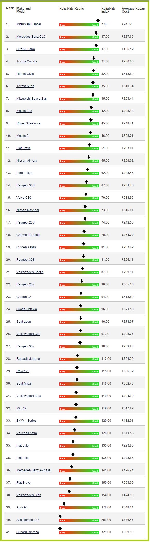 Στην κατηγορία των μικρομεσαίων, στην πρώτη θέση της λίστας με τα 41 συνολικά μοντέλα βρίσκεται το Mitsubishi Lancer με δείκτη αξιοπιστίας «7» και μέσο κόστος επισκευής στις 94,72 στερλίνες (120€). Στη δεύτερη και τρίτη θέση της κατάταξης τοποθετούνται δύο μοντέλα χωρίς ιδιαίτερο εμπορικό ενδιαφέρον (Mercedes CLC και Suzuki Liana), ενώ κατόπιν ακολουθούν τρία ακόμα ιαπωνικά δημοφιλή μοντέλα με ισχυρή παράδοση στον τομέα της αξιοπιστίας, τα Toyota Corolla, Honda Civic και Toyota Auris.