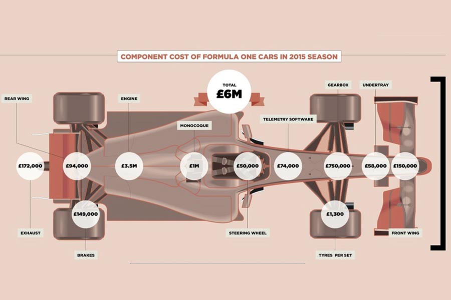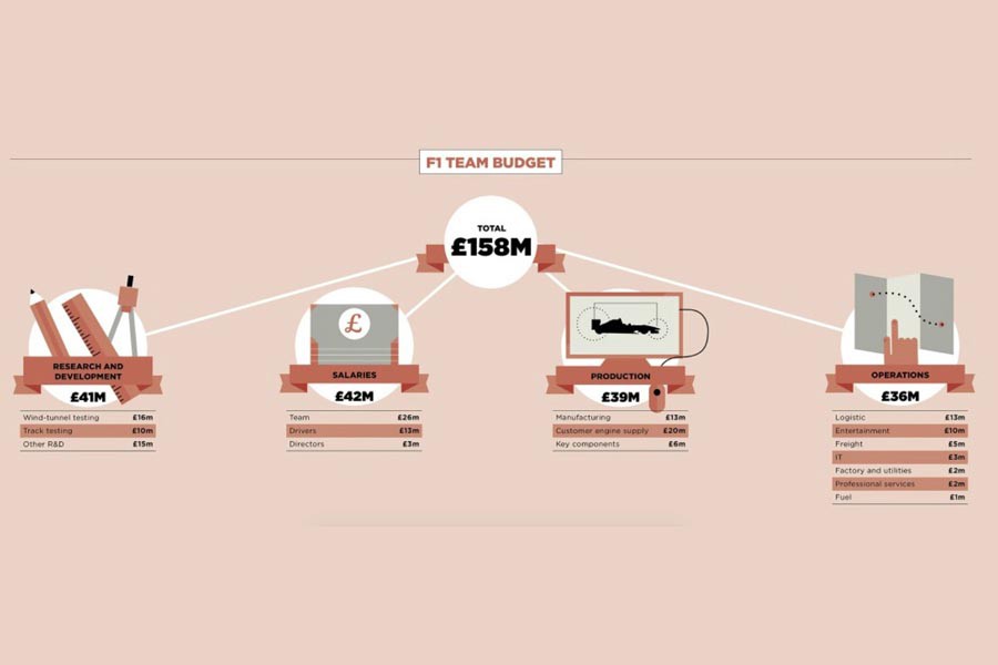 Λίγο πολύ όλοι γνωρίζουμε ότι για να αγωνιστεί έστω και για μια σεζόν μια Formula 1 χρειάζονται πολλά εκατομμύρια, για την εξέλιξη του μονοθέσιου, την προώθησή του, τους μισθούς της ομάδας, τις μετακινήσεις κ.ο.κ. Ο εκδοτικός οίκος Raconteur με έδρα το Λονδίνο, έκανε πρόσφατα έναν υπολογισμό των κοστολογίων και το συνολικό ποσό ανήλθε στις 158.000 στερλίνες, δηλαδή 218.000.000 ευρώ για να τρέξει μια ομάδα για ένα πρωτάθλημα.