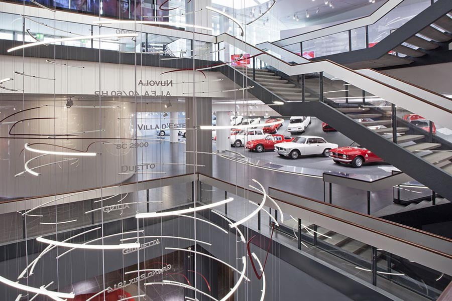 Μια οθόνη με φθίνουσα ελικοειδή κίνηση, που συμβολίζει τη στιλιστική συνέχεια και την τεχνολογική χρονική συνοχή παρουσιάζει 69 μοντέλα τα οποία είναι τα πιο σημαντικά όχι μόνο για την εξέλιξη της μάρκας, αλλά και για την ίδια την ιστορία της αυτοκινητοβιομηχανίας. Από το πρώτο αυτοκίνητο A.L.F.A, το 24 HP, έως τους θρυλικούς νικητές του Mille Miglia όπως το 6C 1750 Gran Sport που οδηγούσε ο Tazio Nuvolari, την 8C coachbuilt by Touring και το Gran Premio 159 «Alfetta 159» νικητή της Formula 1 που οδηγούσε ο Juan Manuel Fangio· από την Giulietta, ένα αυτοκίνητο σύμβολο τη δεκαετία του 1950, έως το Championship 33 TT 12.