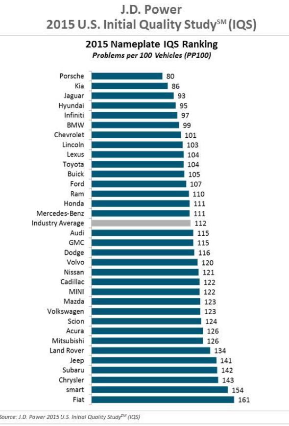 Οι Κορεατικές αυτοκινητοβιομηχανίες έχουν πάρει προβάδισμα στον τομέα της ποιότητας των καινούργιων αυτοκινήτων στις Ηνωμένες Πολιτείες, όπως καταγράφει η σημαντική μείωση του αριθμού των προβλημάτων ανά 100 οχήματα (PP100), σύμφωνα με την “JD Power 2015 U.S. Initial Quality StudySM” (βλ. παρακάτω πίνακα). Εν τω μεταξύ, οι 10 ιαπωνικές μάρκες συλλογικά υποχωρούν κάτω του μέσου όρου του κλάδου για πρώτη φορά στην ιστορία των 29 ετών της μελέτης. Η Μελέτη Αρχικής Ποιότητας (Initial Quality Study) εξετάζει τα προβλήματα που αντιμετωπίζουν οι ιδιοκτήτες καινούργιων αυτοκινήτων κατά τη διάρκεια των πρώτων 90 ημερών της ιδιοκτησίας τους.