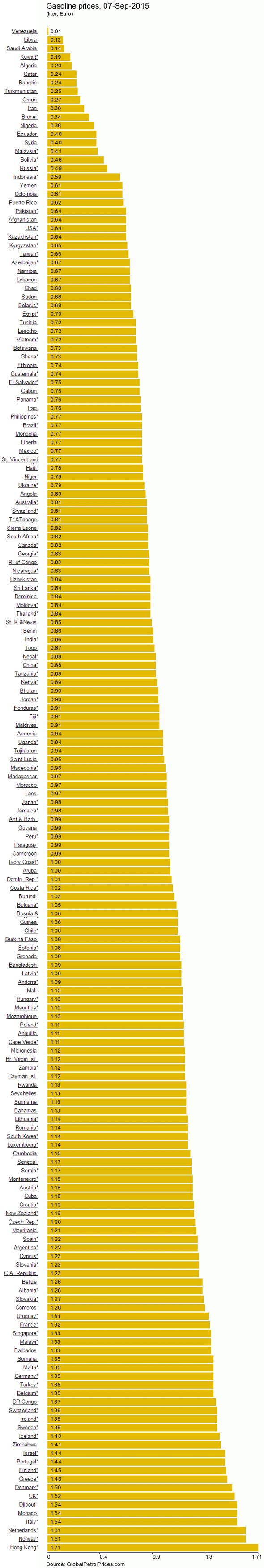 Οι τιμές των καυσίμων παγκοσμίως διαφέρουν σημαντικά μεταξύ των χωρών, αφού ξεκινούν από μόλις 0,01€/λτ. στη Βενεζουέλα και φτάνουν έως τα 1,71€/λτ. στο ακριβότερο Χονγκ Κονγκ (σύμφωνα με την τελευταία μέτρηση στις 7 Σεπτεμβρίου). Κοινώς, στη Βενεζουέλα ένα μικρομεσαίο αυτοκίνητο με 50 λτ. ρεζερβουάρ φουλάρει με μόλις μισό ευρώ. Ωστόσο, στην εν λόγω πετρελαιοπαραγωγό χώρα υπάρχει μεγάλο ποσοστό φτώχιας, ενώ ο μηνιαίος μέσος μισθός ανέρχεται στα 20 δολάρια (18 ευρώ). Η χώρα μας ανήκει μεταξύ των πιο ακριβών σε κόστος βενζίνης, αφού από τις 178 χώρες βρίσκεται στην 170η θέση, με μέση τιμή στα 1,46€/λτ.