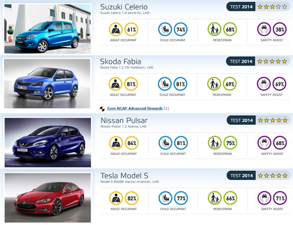 Ο Euro NCAP ανακοίνωσε τα αποτελέσματα των δοκιμών ενεργητικής και παθητικής ασφάλειας σε τέσσερα νέα μοντέλα διαφορετικών κατηγοριών, όπως είναι το μίνι Suzuki Celerio, το μικρό Skoda Fabia, το μικρομεσαίο Nissan Pulsar και το μεγάλο ηλεκτρικό Tesla Model S. Από αυτά μόνο το Suzuki Celerio βαθμολογήθηκε με τρία αστέρια και τα υπόλοιπα με τη μέγιστη διάκριση των 5 αστέρων.