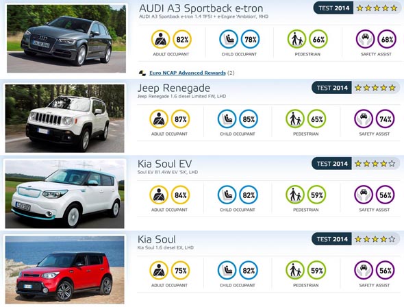 O Euro NCAP λίγες μέρες μετά την ανακοίνωση των αποτελεσμάτων δοκιμών ασφαλείας σε 12 νέα μοντέλα, παρουσιάζει τα νέα τεστ τεσσάρων ακόμα μοντέλων, των Audi A3 Sportback e-tron, Jeep Renegade, Kia Soul και Soul EV. Τα δύο τελευταία δεν τα κατάφεραν και τόσο καλά, αφού αξιολογήθηκαν με 4 αστέρια, μεταξύ των οποίων το Soul με τον θερμικό κινητήρα εμφάνισε μέτρια προστασία στο στήθος στη δοκιμή πλευρικής πρόσκρουσης με στύλο.