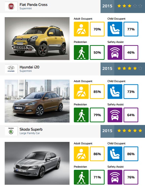 Τα αποτελέσματα των νέων δοκιμών ασφαλείας ανακοίνωσε ο Euro NCAP για τα μοντέλα Fiat Panda Cross, Hyundai i20 και Skoda Superb. Η νέα ναυαρχίδα της Skoda απέσπασε τη μέγιστη διάκριση των 5 αστεριών, χάρη στην ισχυρή προστασία που προσφέρει στους επιβάτες της σε ενδεχόμενο σύγκρουσης και στα συστήματα αυτόνομης πέδησης έκτακτης ανάγκης.