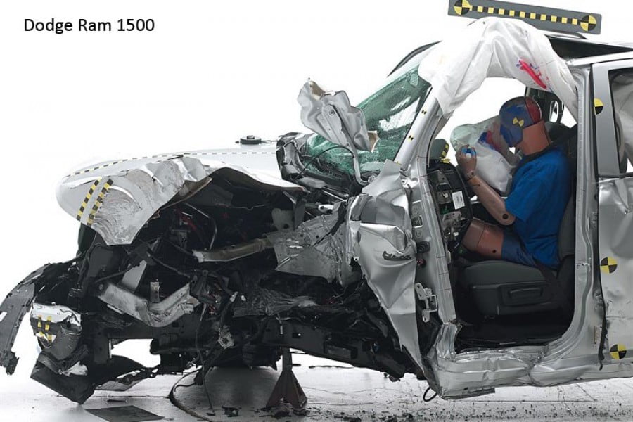 To δημοφιλέστερο όχημα στις Η.Π.Α., το Ford F-150 ήταν αυτό που έλαβε την αξιολόγηση Top Safety Pick, ενώ στο αντίθετο άκρο τοποθετήθηκε το Dodge Ram 1500, τόσο με τη διπλή καμπίνα όσο και με την πιο κοντή. Ο οδηγός του Dodge σφήνωσε, αφού ο ζωτικός του χώρος μειώθηκε μέχρι 43 εκατοστά. Μέτρια ήταν τα συνολικά αποτελέσματα και για τα pick-up μοντέλα Toyota Tundra και GMC Sierra, όπως μπορείτε να δείτε πιο αναλυτικά στον παρακάτω πίνακα και στα βίντεο.