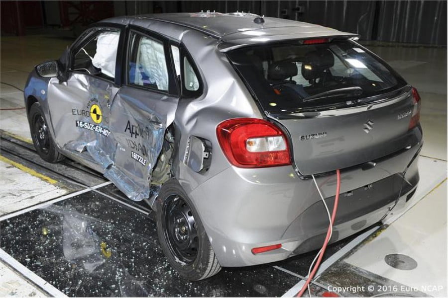 Το νέο Baleno έλαβε μόνο 3 αστέρια στην έκδοση με τον στάνταρ εξοπλισμό ασφαλείας και 4 με το πακέτο ασφαλείας Radar Brake Support, το οποίο περιλαμβάνει σύστημα αυτόνομης πέδησης για χαμηλές και πιο γρήγορες ταχύτητες (AEB City και AEB Inter-Urban). Στο τεστ της πλαγιομετωπικής σύγκρουσης ο θάλαμος των επιβατών του Suzuki παρέμεινε σταθερός και ο οδηγός προστατεύτηκε αποτελεσματικά, όμως αυξημένες δυνάμεις δέχτηκε το στήθος του οδηγού και συνοδηγού.