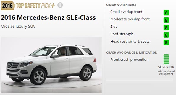 Το μεγάλο SUV Mercedes GLE-Class έλαβε τη μέγιστη διάκριση Top Safety Pick+ στα crash tests του αμερικάνικου ινστιτούτου ασφαλείας IIHS, προσφέροντας υψηλή ασφάλεια στους επιβάτες της σε κάθε είδος σύγκρουσης. Παράλληλα στην αξιολόγηση λαμβάνονται υπόψη και τα διάφορα συστήματα πρόληψης σύγκρουσης που εφοδιάζεται, όπως είναι το αυτόνομο σύστημα πέδησης Pre-Safe Brake.