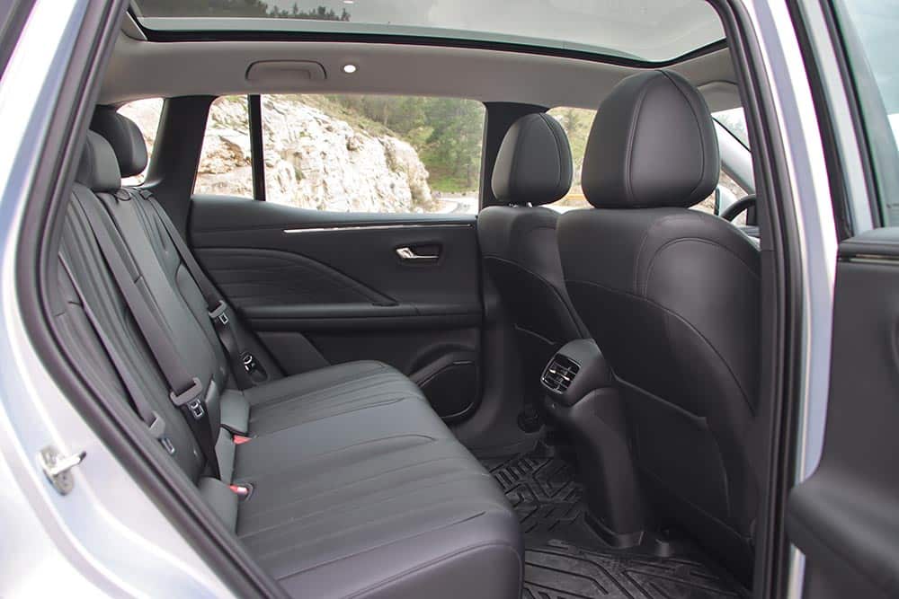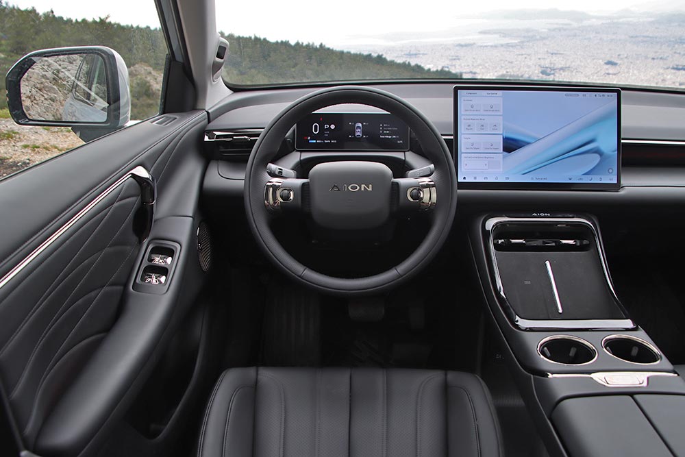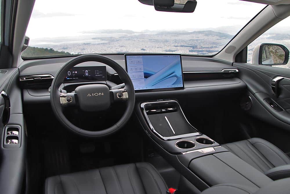 Ανοίγοντας τη στιβαρή πόρτα του οδηγού και μπαίνοντας στην ευρύχωρη και ευήλια (λόγω της μεγάλης ηλιοροφής) καμπίνα του AION V εισπράττεις αμέσως μια αίσθηση ζεστασιάς και ηρεμίας, τη σχεδιαστική φιλοσοφία «Urban zero-pressure» όπως χαρακτηριστικά το ονομάζει η εταιρία. Tα υλικά που έχουν χρησιμοποιηθεί είναι πολύ καλής ποιότητας, είναι κατά κύριο λόγο μαλακά με ωραία υφή, ενώ η συναρμογή είναι στιβαρή με απουσία κάθε είδους τριγμών. Οι σχεδιαστές έχουν αξιοποιήσει στο έπακρο τα πλεονεκτήματα της «ηλεκτρικής» αρχιτεκτονικής, προσφέροντας χώρους που παραπέμπουν σε πολύ ανώτερη κατηγορία. Στο πίσω κάθισμα ο αέρας για τα πόδια είναι τόσο πολύς, που περισσεύει και όταν κάθονται ψηλά άτομα, συν του ότι διευκολύνει πολύ το εντελώς επίπεδο δάπεδο. Το κάθισμα του συνοδηγού μετατρέπεται εύκολα σε ημικλινή θέση, ενοποιείται με τη δεύτερη σειρά και δημιουργεί μια ενιαία επιφάνεια τύπου «queen-size». Με την αφαίρεση του προσκέφαλου και με ένα μόνο πάτημα, το εμπρός κάθισμα ισιώνει και «κουμπώνει» με το πίσω, διαδικασία που ενεργοποιείται είτε από την κεντρική οθόνη είτε με φωνητική εντολή, αρκεί να πεις «Hey Baby» και την εντολή που θέλεις!