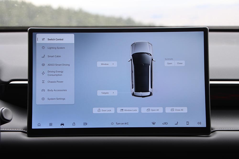 Το περιβάλλον του GAC AION V είναι πλήρως ψηφιακό (με απουσία φυσικών διακοπτών για τα βασικά), με έξυπνες λειτουργίες φωνητικού ελέγχου και στοιχεία άνεσης, όπως θερμαινόμενα καθίσματα (εμπρός/πίσω) με μασάζ 8 σημείων, ηλεκτρική ηλιοροφή 2,14 τ.μ. και ενσωματωμένο ψυγείο -στην κορυφαία έκδοση- με λειτουργίες ψύξης και θέρμανσης. Το εσωτερικό περιβάλλον λειτουργεί ως σύγχρονο ψηφιακό οικοσύστημα, ενσωματώνοντας τεχνολογίες αιχμής και δυνατότητες over-the-air αναβαθμίσεων, που διασφαλίζουν συνεχή εξέλιξη και βελτιστοποίηση της εμπειρίας οδήγησης. Ο πίνακας οργάνων των 8,88 ιντσών προβάλλει τις τελείως απαραίτητες πληροφορίες, χωρίς να κουράζει με άσκοπα στοιχεία. Αντί για ποσοστό μπαταρίας για παράδειγμα υπάρχει μόνο η ένδειξη των υπολειπόμενων χιλιομέτρων. Στο κέντρο βρίσκουμε μια ταχύτατη σε απόκριση οθόνη αφής 14,6 ιντσών που συγκεντρώνει πλοήγηση, πολυμέσα και ρυθμίσεις με μικρή όμως γραμματοσειρά στο μενού που δυσκολεύει κάπως τη χρήση. Όλες οι λειτουργίες του οχήματος γίνονται μέσα από το όχι και τόσο απλό μενού, κάτι που αφαιρεί πόντους από την εργονομία. Στο κομμάτι της συνδεσιμότητας, το AION V ενσωματώνει ταχύτατη ασύρματη χρήση Apple CarPlay και Android Auto (αναμένεται σύντομα), ενώ παράλληλα προσφέρει online υπηρεσίες μουσικής και πλοήγησης για πλήρη αυτονομία, ακόμη και χωρίς τη σύνδεση smartphone.