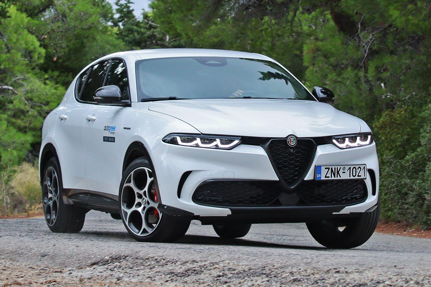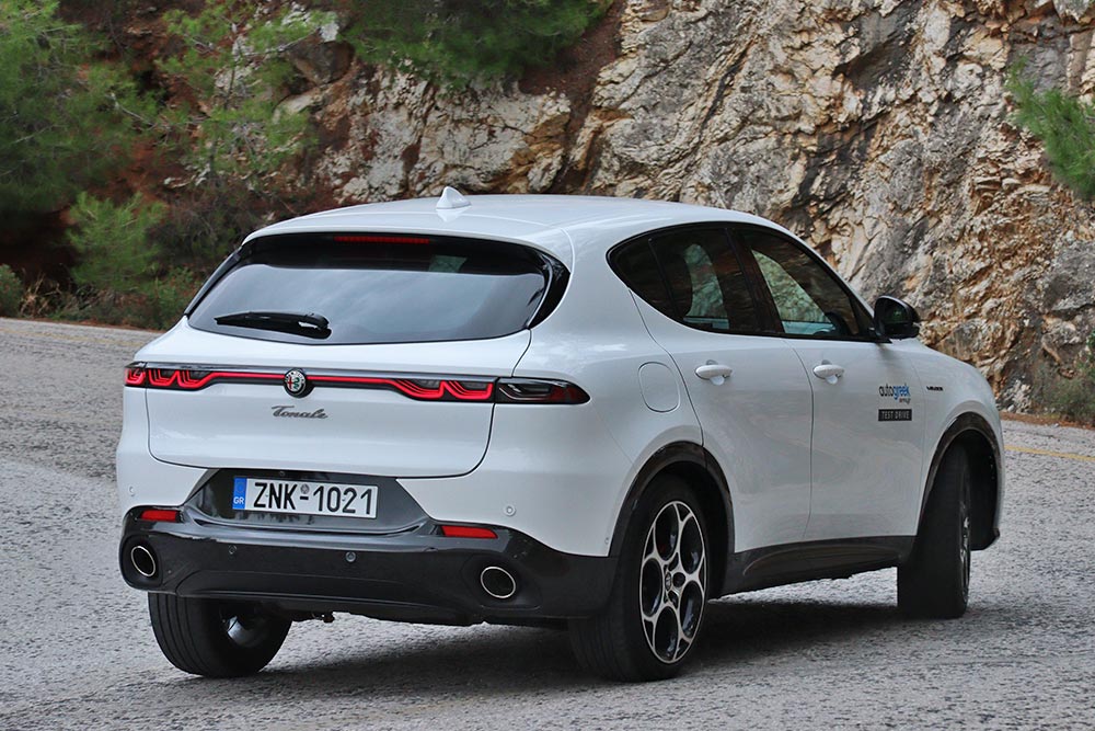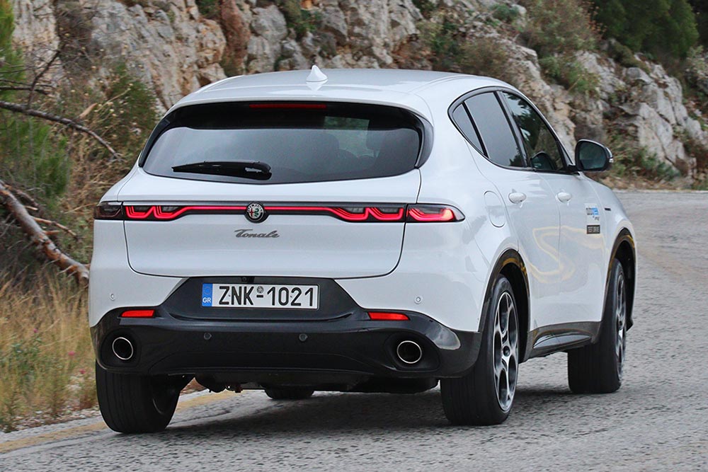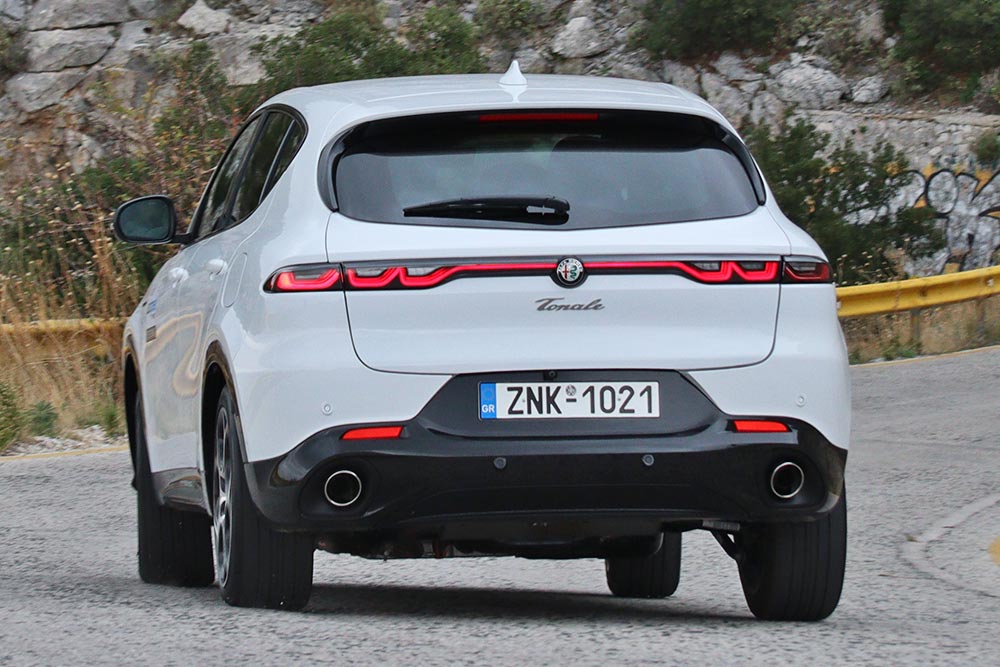 Η Alfa Romeo Tonale ξεχωρίζει αμέσως στο δρόμο με το δυναμισμό και τη γοητεία που εκπέμπει. Ακόμα και στο λευκό χρώμα του αυτοκινήτου της δοκιμής (έκδοση Veloce) δε μειώνεται η ένταση από το σπορ ταπεραμέντο της Tonale. Σε αυτό συμβάλλουν και οι μαύρες λεπτομέρειες που έρχονται σε αντίθεση με τις άσπρες επιφάνειες του πληθωρικού αμαξώματος των 4.528 χλστ. μήκους. Μπροστά κυριαρχεί η κλασική τριγωνική μάσκα χωρίς νίκελ, τα 3+3 full-LED φωτιστικά σώματα και οι ευμεγέθεις αεραγωγοί στον προφυλακτήρα. Οι πλευρικές καλοσμιλεμένες επιφάνειες ακολουθούν το σφηνοειδές προφίλ, ενώ μια διακριτική λεπτομέρεια κάνει τη διαφορά. Στο πίσω αριστερό φινιστρίνι του παραθύρου, ακριβώς πιο πάνω από το κάλυμμα για τη θύρα φόρτισης βρίσκεται ανασχεδιασμένο το ιστορικό έμβλημα της Alfa Romeo, το «biscione – φιδάκι». Το κεφάλι του έχει αντικατασταθεί με πρίζα σούκο και ο κεραυνός συμβολίζει την υψηλή τάση ρεύματος. Χαμηλότερα το ενδιαφέρον εστιάζεται στις 19 ιντσών ζάντες με το σχέδιο «telephone dial» και τις κόκκινες δαγκάνες της Brembo με το λογότυπο της Alfa Romeo που τοποθετούνται στη Veloce. Πίσω κυριαρχούν τα λεπτά φανάρια που ενώνονται με μια φωτεινή κόκκινη λωρίδα LED και με σχεδιασμό αντίστοιχο των μπροστινών.