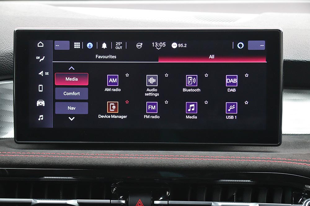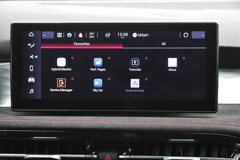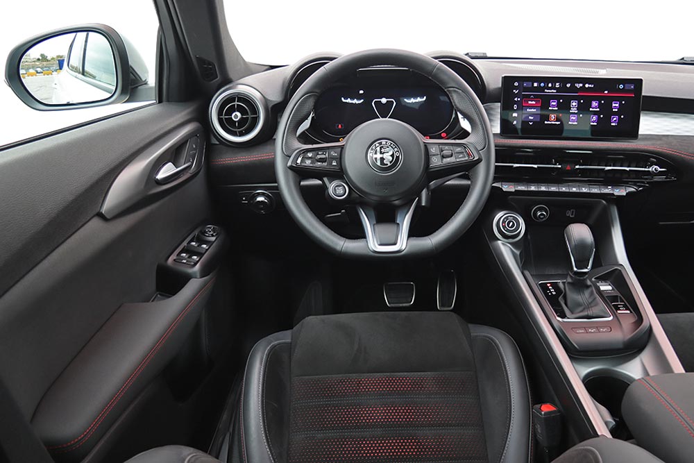 Ο θάλαμος επιβατών της Tonale PHEV δε διαφοροποιείται από τις «συμβατικές» εκδόσεις και διακρίνεται αμέσως για την πολυτέλεια και τα σπορτίφ γνωρίσματα που έχουν ταιριάξει με ισορροπημένο τρόπο. Ο 12,3 ιντσών ψηφιακός και διαμορφώσιμος πίνακας οργάνων «Cannocchiale» με τα σύγχρονα γραφικά, παραπέμπει στο παραδοσιακό αναλογικό καντράν της μάρκας. Στο κέντρο του ταμπλό φιλοξενείται η στάνταρ οθόνη αφής των 10,25 ιντσών με το εύχρηστο μενού. Ορισμένα τμήματα όπως οι στρογγυλοί αεραγωγοί, ο διακόπτης «Start-Stop» και τα -όχι ιδιαίτερα πρακτικά και κομψά- αλουμινένια σταθερά paddles, προέρχονται από τις μεγαλύτερες Alfa Romeo. Πιο χαμηλά από τους κεντρικούς αεραγωγούς είναι τοποθετημένα τα χρήσιμα χειριστήρια για τον κλιματισμό και πιο κάτω η σχετικά δύσχρηστη βάση για την ασύρματη φόρτιση κινητού. Σε βολική θέση είναι τοποθετημένο το περιστροφικό χειριστήριο «DNA», ενώ ο οδηγός θα βρει εύκολα τη θέση που του ταιριάζει.