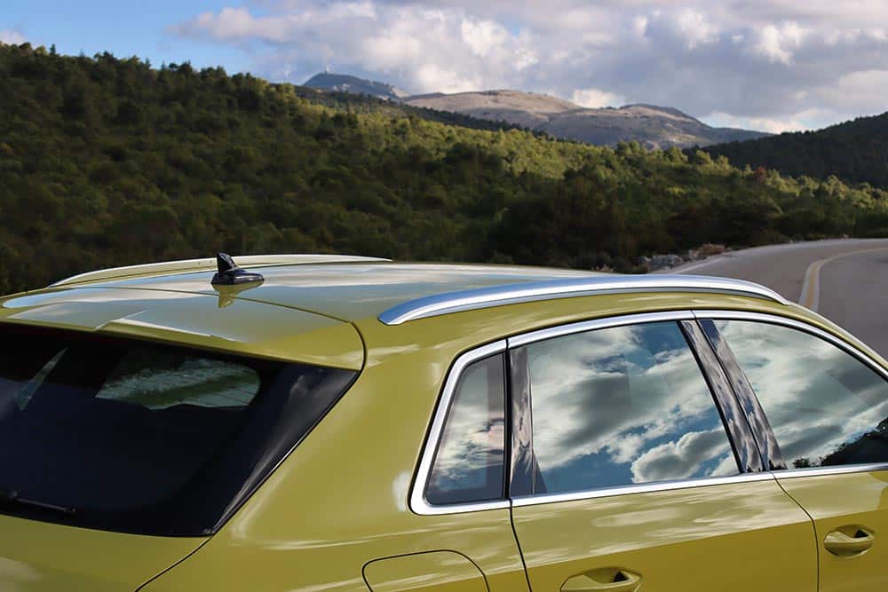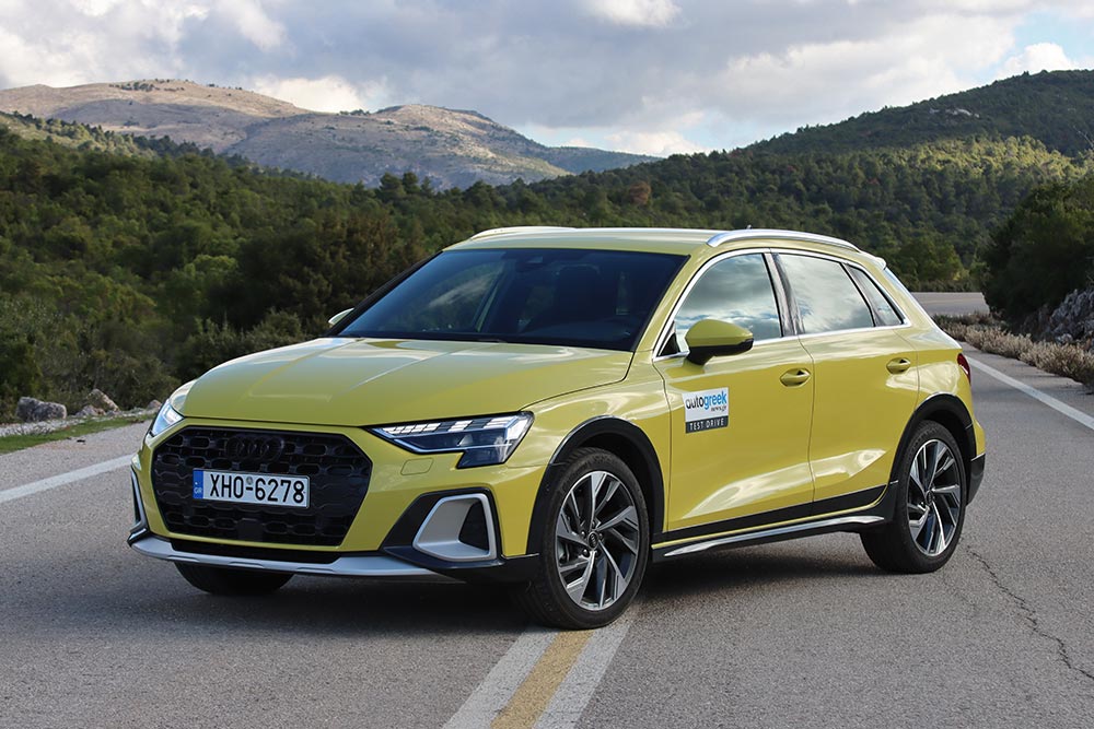 Το Audi A3 allstreet ξεχωρίζει αμέσως από τις υπόλοιπες εκδόσεις του και παρουσιάζει αρκετό ενδιαφέρον γιατί διαθέτει πιο περιπετειώδη εμφάνιση, χωρίς όμως να χάσει ούτε στο ελάχιστο το δυναμισμό και τον premium χαρακτήρα του χάτσμπακ -το αντίθετο θα λέγαμε. Ειδικά το εικονιζόμενο με το εξωτερικό μεταλλικό χρώμα κίτρινο Python (868 ευρώ χωρίς Φ.Π.Α και Τέλος Ταξινόμησης) αναδεικνύει περεταίρω το crossover αμάξωμα με τα σκουρόχρωμα και ασημί προστατευτικά στοιχεία στους προφυλακτήρες, στους θόλους των τροχών και στα μαρσπιέ. Παράλληλα διαθέτει περισσότερο αέρα από το έδαφος κατά 30 χλστ. (15 χλστ. από την ανάρτηση και άλλα 15 χλστ. από τους τροχούς), βελτιώνοντας την πρακτικότητα, την ορατότητα και κάνοντας πιο άνετη την επιβίβαση και αποβίβαση. Πρόσθετα η κάθετη οκταγωνική μάσκα Singleframe σε μαύρο ματ χρώμα με την κυψελοειδή δομή παραπέμπει στα SUV Audi της σειράς Q. Οι ζάντες είναι στάνταρ 17 ιντσών (205/55 R17), όμως υπάρχουν και 18 ιντσών (225/45 R18) όπως στο αυτοκίνητο της δοκιμής ή 19 ιντσών (235/40 R19). Το δυναμισμό αλλά και την ορατότητα ενισχύουν οι έξτρα προβολείς Matrix LED με φώτα ημέρας που ρυθμίζονται σε διαφορετικά μοτίβα μέσω του infotainment, αλλά στοιχίζουν αρκετά χρήματα (1.823 ευρώ με Φ.Π.Α χωρίς Τέλος Ταξινόμησης).