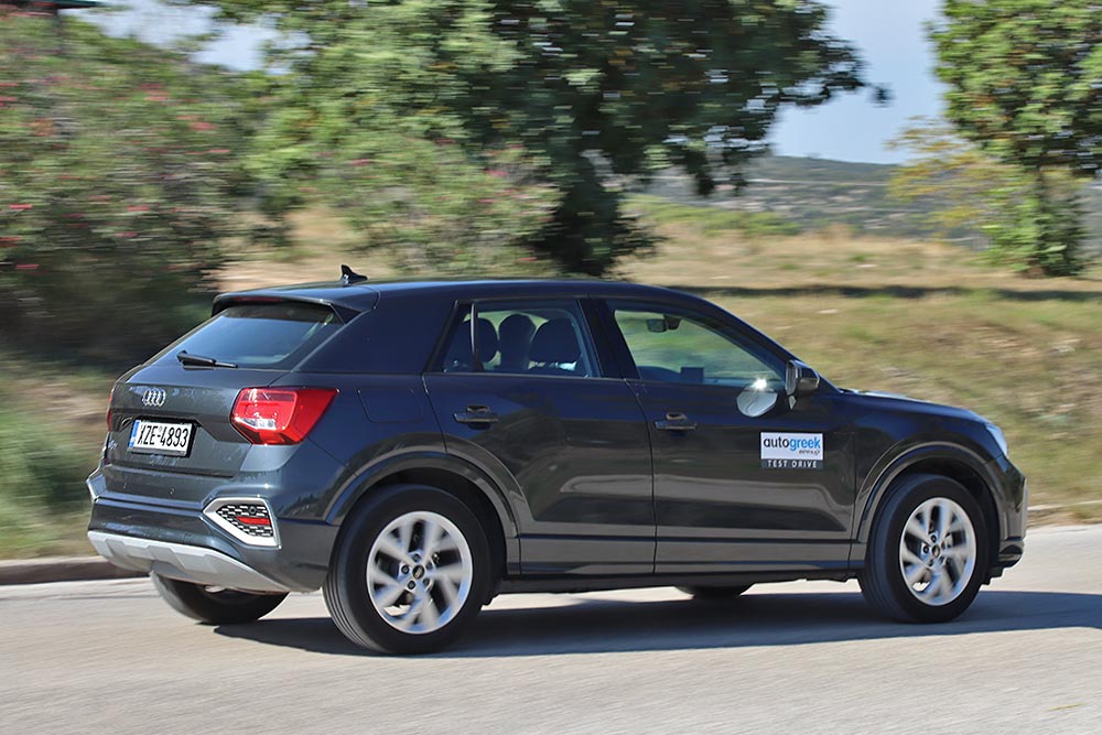 Ο 1.0 TFSI 110 PS που αποτελεί τη βάση κίνησης στο Audi Q2, κινεί αξιοπρεπώς το αμάξωμα των 1.250 κιλών καθαρού βάρους. Γεγονός που συμβάλλουν με τη σειρά τους η ροπή των 200 Nm που αποδίδεται από τις 2.000 σ.α.λ. και το κατάλληλης κλιμάκωσης χειροκίνητο κιβώτιο των 6 ταχυτήτων (αυτόματο μόνο το 1.5 TFSI). Το τράβηγμα που εμφανίζει είναι γεμάτο από τις στροφές και άνω που αποδίδεται η ροπή, ενώ ανεβάζει αγόγγυστα ρυθμούς μέχρι ψηλά, εξασφαλίζοντας σβέλτες επιταχύνσεις (0-100 χλμ./ώρα σε 11,1 δλ.). Το μηχανικό σύνολο λειτουργεί στο θερμοδυναμικό κύκλο Miller και ενσωματώνει τουρμπίνα με πτερύγια μεταβλητής γεωμετρίας, ενώ δεν συνοδεύεται από κανενός τύπου εξηλεκτρισμού, ούτε καν mild hybrid. Start/stop έχει, όμως όταν εκκινεί ο κινητήρας μετά από μια στάση (π.χ. στο φανάρι) ακούγεται η χαρακτηριστική «μιζιά». Η πολύ καλή ηχομόνωση κρατά εκτός καμπίνας τους όποιους παρασιτικούς θορύβους και δύσκολα θα αντιληφθεί ο επιβάτης ότι πρόκειται για τρικύλινδρο μοτέρ. Η κατανάλωση σε μεικτές συνθήκες δοκιμής βρέθηκε στα 7,5 λτ./100 χλμ., με δυνατότητα προς τα κάτω χωρίς πολύ προσπάθεια. Στο ταξίδι η 6η ταχύτητα κρατά τον κινητήρα εντός της ωφέλιμης ισχύος του (130 χλμ./ώρα με 3.000 σ.α.λ.), με το θόρυβο να μην ενοχλεί και την κατανάλωση να πέφτει περίπου κατά 1 λτ./100 χλμ.