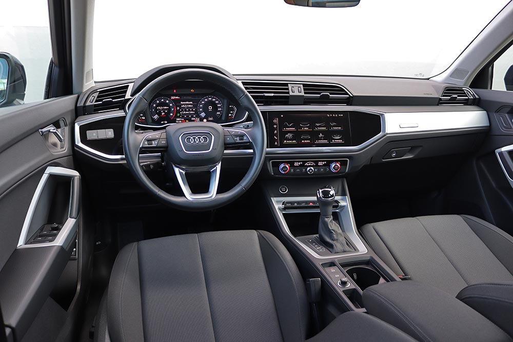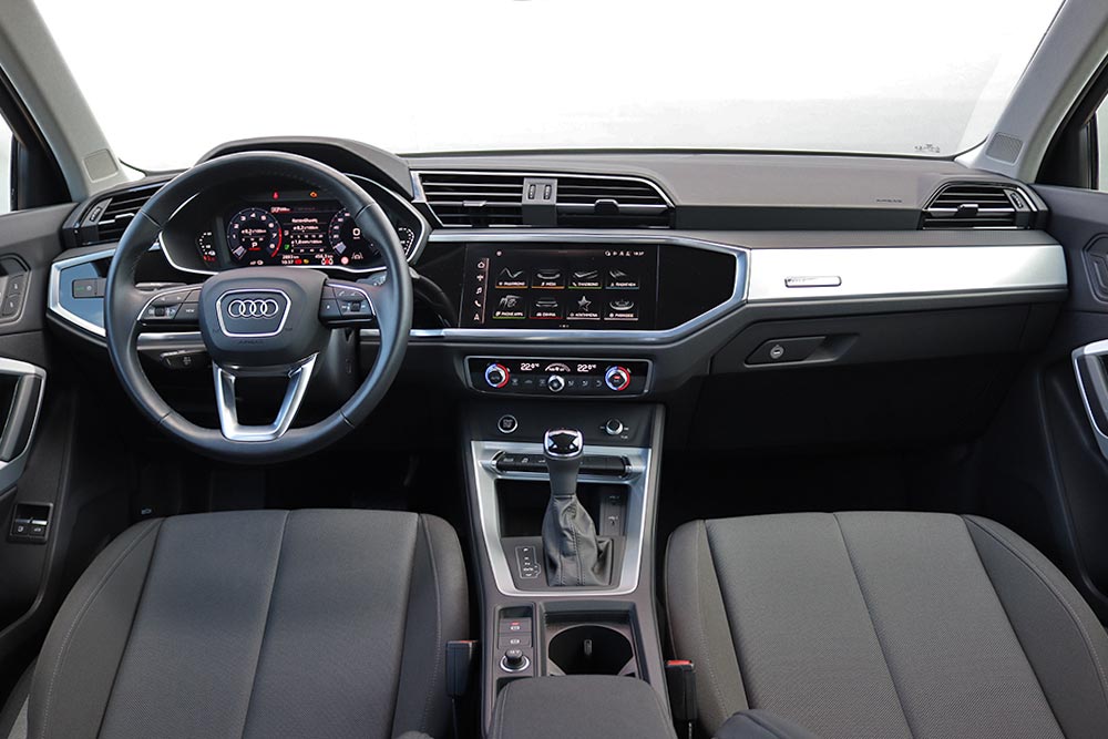 Περνώντας στο εσωτερικό, το περιβάλλον συνεχίζει να είναι γνώριμο, όπου από την πρώτη επαφή γίνεται ξεκάθαρη η απτή πολυτέλεια. Όπως και στις υπόλοιπες εκδόσεις του Audi Q3, έτσι και στην PHEV εκδοχή του τα υλικά είναι ποιοτικά με μαλακά πλαστικά σε πολλές επιφάνειες, ενώ η συναρμογή και το φινίρισμα έχουν γίνει με προσοχή στη λεπτομέρεια. Μάλιστα η απουσία μηχανικών ήχων, όταν το Q3 45 TFSI e κινείται αποκλειστικά με τον ηλεκτροκινητήρα, ενισχύει ακόμα περισσότερο την ποιοτική αίσθηση που απολαμβάνουν οι επιβάτες.