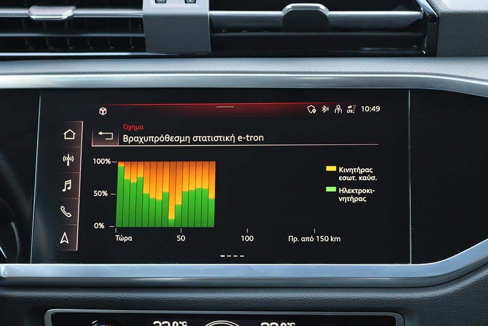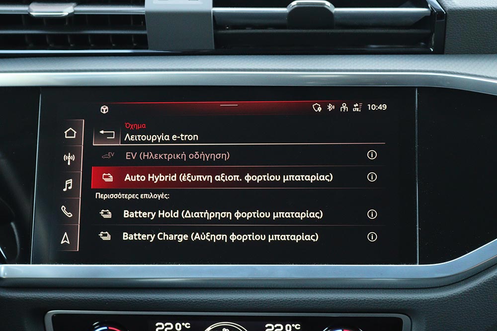 Όταν θέσετε σε λειτουργία το Q3 45 TFSI e, τότε αυτό κινείται αρχικά µε το ηλεκτρικό μοτέρ. Με μια φόρτιση μπορεί να καλύψει έως 51 χλμ. και με μέγιστη ταχύτητα έως 140 χλμ./ώρα. Με την επιλογή «Auto Hybrid», το σύστημα εποπτεύει πάντοτε τη συνεργασία των δύο κινητήρων, µε το ηλεκτρομοτέρ να υποστηρίζει το έργο του 1.4 TFSI όποτε απαιτηθεί δύναμη. Στο e-tron μενού υπάρχουν άλλες δύο επιλογές για τη διαχείριση της ηλεκτρικής ενέργειας: Η «Battery Hold» φροντίζει να υπάρχει πάντοτε ένα ποσοστό ενέργειας για μετάπειτα χρήση και το «Battery Charge» που χρησιμοποιεί το θερμικό κινητήρα ως γεννήτρια για να φορτίσει την μπαταρία, με τον ανάλογο βέβαια αντίκτυπο στην κατανάλωση καυσίμου. Μπορείτε να φορτίσετε την μπαταρία του Audi Q3 45 TFSI e είτε χρησιμοποιώντας συνεχές ρεύμα (DC) με ισχύ 11 kW, είτε με εναλλασσόμενο ρεύμα (AC), με ισχύ 3,6 kW. Με το τελευταίο, μια άδεια μπαταρία μπορεί να επαναφορτιστεί σε 3 ώρες και 45 λεπτά χρησιμοποιώντας το στάνταρ καλώδιο φόρτισης, ενώ σε απλή οικιακή πρίζα απαιτούνται περίπου έξι ώρες.