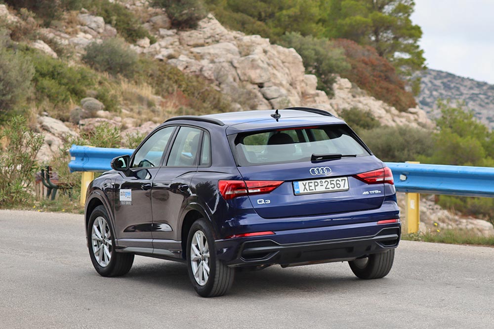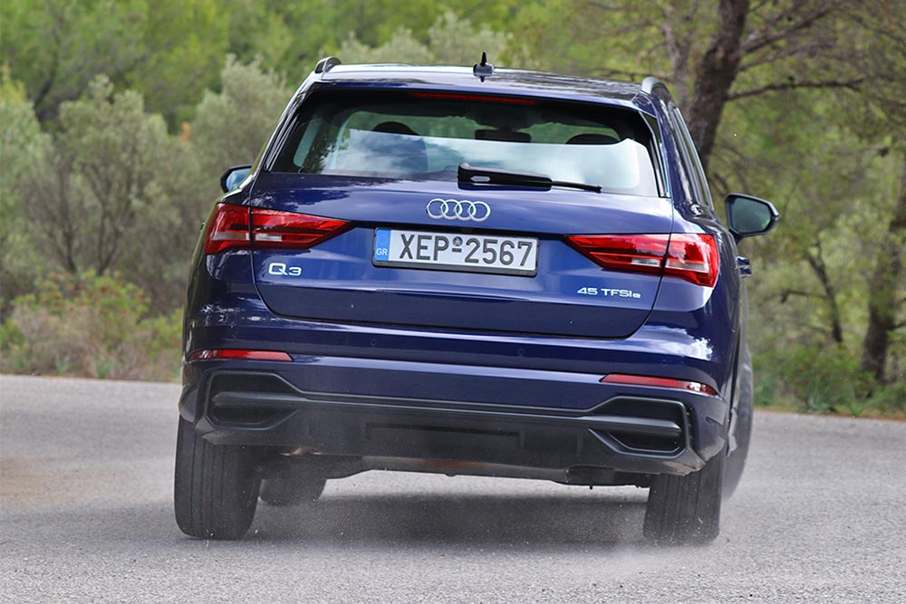 Στην εθνική οδό, το plug-in υβριδικό Audi Q3 είναι σταθερό σε όλο το φάσμα του ταχυμέτρου, ενώ σε εξαιρετικά επίπεδα βρίσκεται η ηχομόνωση, με τους επιβαίνοντες να απολαμβάνουν ξεκούραστες διαδρομές. Σε πιο κλειστά κομμάτια, η ανάρτηση προσφέρει αυξημένη πρόσφυση, κρατώντας σε λογικά επίπεδα τις κλίσεις του αμαξώματος. Υπό πίεση η κύρια αντίδραση του γερμανικού SUV είναι η υποστροφή, κατάσταση που είναι εύκολα διαχειρίσιμη από τον οδηγό. Τώρα αν αυτός δεν αντιδράσει έγκαιρα, τα ηλεκτρονικά βοηθήματα θα βάλουν με κομψό τρόπο την τάξη. Το τιμόνι από την πλευρά του παρέχει όση αίσθηση απαιτείται και τα φρένα έχουν συνολικά καλή συμπεριφορά.