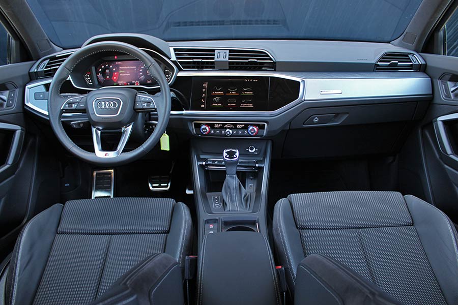 Περνώντας στο εσωτερικό του Q3 Sportback, η εικόνα είναι γνώριμη από εκείνη του Q3, με τη διαφορά να εντοπίζεται κυρίως στη χαμηλότερη οροφή, με την πιο έντονη κλίση στο τελείωμά της. Με το άνοιγμα της πόρτας, το βλέμμα πέφτει στις δύο ψηφιακές οθόνες: Από το βασικό εξοπλισμό περιλαμβάνεται ένας ψηφιακός πίνακας οργάνων 10,25 ιντσών και μια οθόνη αφής 8,8 ιντσών, όμως προαιρετικά μπορεί να φτάσουν τις 12,5 και 10,25 ίντσες αντίστοιχα. Ωστόσο, μια κάμερα οπισθοπορείας θα έπρεπε να ανήκε στο βασικό εξοπλισμό, όταν περιλαμβάνεται στάνταρ σε πολύ φθηνότερα αυτοκίνητα. Επίσης, η οθόνη του infotainment θέλει λίγο εξοικείωση, όπως είναι η ρύθμιση για την αλλαγή σταθμού στο ραδιόφωνο, που απαιτεί περιττές ενέργειες στα υπομενού και αποσπά κάπως την προσοχή από το δρόμο.