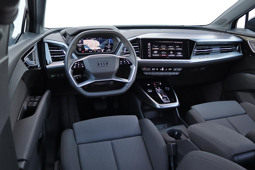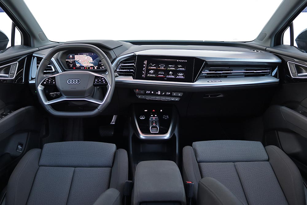 Και στο εσωτερικό το Audi Q4 e-tron φέρει τη νέα σχεδιαστική σφραγίδα της μάρκας, με τις καθαρές γραμμές και το οδηγοκεντρικό ταμπλό να αποτελούν σήματα κατατεθέντα για την καμπίνα του γερμανικού ηλεκτρικού SUV. Στο ανώτερο σημείο της κονσόλας συναντάμε τη μεγάλη οθόνη αφής των 10,1 ιντσών, ενώ για την πληροφόρηση του οδηγού υπάρχει μια ακόμα με διαγώνιο 10,25 ιντσών και δυνατότητα παραμετροποίησης, σύμφωνα με τις ανάγκες του χειριστή. Το τεχνολογικό highlight του Q4 είναι το νέο head-up display επαυξημένης πραγματικότητας, με το οποίο μπορεί να εφοδιαστεί προαιρετικά το Audi Virtual Cockpit, διευκολύνοντας κατά πολύ την πλοήγηση του οδηγού, αφού είναι εξαιρετικά ευανάγνωστο.