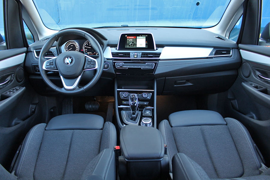 Η καμπίνα της BMW 218i Active Tourer είναι αρκετά γνώριμη, μιας και διαθέτει το βασικό σχεδιασμό που έχουμε δει και σε άλλα μοντέλα της γκάμας. Τα υλικά που έχουν χρησιμοποιηθεί είναι κορυφαίας ποιότητας, με πολύ καλή συναρμογή και τελικό φινίρισμα υπεράνω κριτικής. Στο ανώτερο σημείο της κεντρικής κονσόλας θα ξεχωρίσετε την μεγάλη οθόνη του συστήματος infortainment, η οποία σας παρέχει ότι πληροφορία θελήσετε, ενώ εκεί αποτυπώνονται και οι ρυθμίσεις για το Driver Experience Control με τα τρία προγράμματα οδήγησης, Eco Pro, Comfort και Sport.