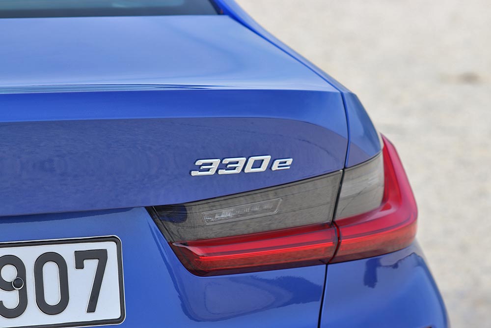 Σε επίπεδο σχεδιασμού τώρα η 330e δεν έχει διαφορές από μια 3άρα με κινητήρα εσωτερικής καύσης, παρά μόνο το έξτρα πορτάκι για τη θύρα φόρτισης του ηλεκτροκινητήρα. Μυώδης σε κάθε της εκατοστό, η BMW 330e διακρίνεται με τους επιθετικούς προφυλακτήρες, αλλά και από τα μακρόστενα φωτιστικά σώματα. Το σχεδιαστικό παιχνίδι συνεχίζεται στο πίσω μέρος, που κι αυτό συγκεντρώνει βλέμματα θαυμασμού, με τα εμφατικά φωτιστικά σώματα. Αυτά ταιριάζουν απίστευτα με την ελαφρώς ανασηκωμένη πόρτα, για αεροδυναμικούς λόγους, του χώρου αποσκευών. Το παρουσιαστικό της τονίζεται από το μήκος των 4.709 χλστ., αλλά και από το πλάτος των 1.827 χλστ., με το σφηνοειδές προφίλ να ενισχύεται κι από το χαμηλό ύψος των 1.444 χλστ.