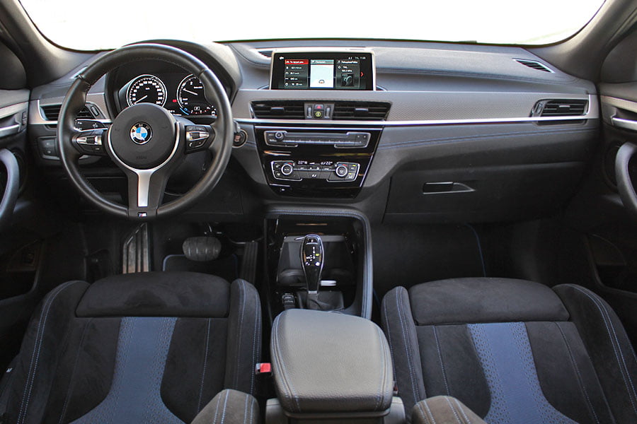Το εσωτερικό της BMW X2 είναι καλοφτιαγμένο και με την τυπική (για μια BMW) διαμόρφωση του ταμπλό. Άρτια κατασκευασμένο και εξαιρετικά στιβαρό, θα σας προσφέρει άφθονε δόσεις πολυτέλειας. Την στιγμή που έχουμε να κάνουμε με ένα μοντέλο της BMW, τα πάντα είναι κατασκευασμένα με επίκεντρο τον οδηγό. Έτσι η κονσόλα είναι στραμμένη προς αυτόν, τα καθίσματα προσφέρουν πολύ καλή πλευρική στήριξη και η γενικότερη αίσθηση που δημιουργείται είναι περισσότερο αυτής μια σπορ κατασκευής, παρά ενός crossover. Ο πίνακας οργάνων είναι ευανάγνωστος, όπου τα δύο μεγάλα κυκλικά όργανα (στροφόμετρο και ταχύμετρο) προσφέρουν την απαιτούμενη πληροφόρηση στον οδηγό. Στο κέντρο του ταμπλό και στο ανώτερο σημείο του, υπάρχει η οθόνη του συστήματος πολυμέσων, το οποίο ελέγχεται με το πιεζοπεριστροφικό χειριστήριο για το iDrive.