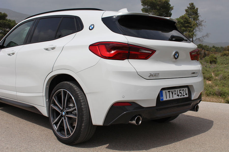 Η BMW X2 έχει μία σειρά από σχεδιαστικά στοιχεία που τη διαφοροποιούν από τις υπόλοιπες BMW και δείχνει πως οι σχεδιαστές της είχαν αρκετή ελευθερία όταν κλήθηκαν να τη δημιουργήσουν. Μπορεί σε γενικές γραμμές να φαίνεται από την πρώτη στιγμή πως έχουμε να κάνουμε με μία BMW, παρόλα αυτά φροντίζει να δείχνει τη διαφορετικότητά της. Πρώτα από όλα στο εμπρός μέρος ναι μεν φιγουράρει η κλασσική μάσκα με τις κάθετες γρίλιες, από την άλλη δε είναι η πρώτη φορά που αυτή είναι πιο φαρδιά στο κάτω μισό της από ότι στο άνω άκρο της. Επίσης, μετά από πάρα πολλές δεκαετίες συναντάμε το σήμα της BMW εκτός από εμπρός και πίσω και στις πίσω κολόνες του αυτοκινήτου. Και αυτά είναι στοιχεία που είχε και το πρωτότυπο μοντέλο που είδαμε για πρώτη φορά το 2016 στην έκθεση αυτοκινήτου του Παρισιού και από το οποίο εν τέλει δεν απέχει και πολύ η X2 παραγωγής. Οι στρογγυλοί προβολείς ομίχλης εμπρός στα άνω άκρα του προφυλακτήρα είναι στοιχείο στο οποίο δεν μας έχει συνηθίσει η βαυαρική μάρκα, τα πίσω φώτα είναι πολύ επιθετικά σχεδιαστικά, ενώ οι «ώμοι» του αμαξώματος είναι αρκετά έντονοι και η κλίση του εμπρός παρμπρίζ το ίδιο.