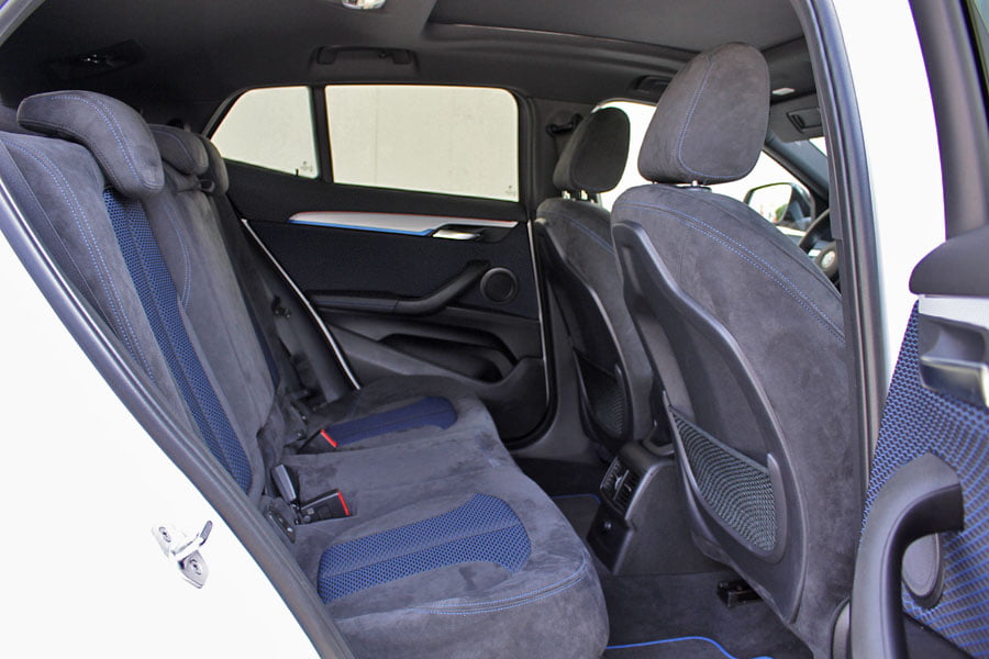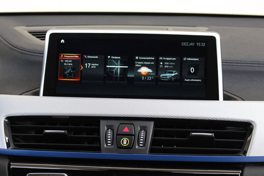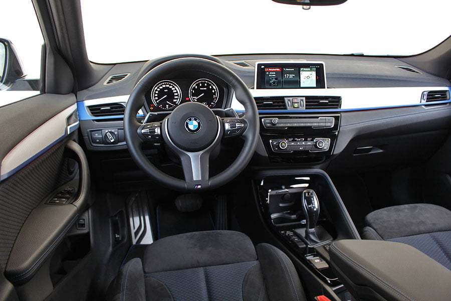 Το εσωτερικό της BMW X2 σίγουρα ως ένα βαθμό επηρεάζεται από τον σχεδιασμό του αμαξώματος. Έτσι, οι μεγάλες μεταλλικές επιφάνειες, που δεν αφήνουν πολύ χώρο στα τζάμια, σε συνδυασμό με την κυριαρχία του μαύρου χρώματος στην καμπίνα, σε κάνουν να νιώθεις πως πρόκειται για μία σπορ κατασκευή. Τα υλικά είναι κορυφαία και η συναρμογή τους επίσης και σου δημιουργούν τη βεβαιότητα πως όσο ήλιο, σκόνη και… κοπάνημα και να φάνε, δεν θα τρίξουν και δεν θα χαλάσουν ποτέ. Ο πίνακας οργάνων αποτελείται από δύο μεγάλα κυκλικά όργανα για στροφόμετρο και ταχύμετρο, ενώ στο κέντρο του ταμπλό ψηλά κυριαρχεί η οθόνη του συστήματος πολυμέσων με το πιεζοπεριστροφικό χειριστήριο για το iDrive Πιο κάτω της βρίσκονται σε στοίχιση οι αεραγωγοί, το ηχοσύστημα και το πάνελ χειρισμού του κλιματισμού. Στην περίπτωση του δικού μας αυτοκινήτου βέβαια υπήρχαν και τα αξεσουάρ της M, όπως το τριάκτινο τιμόνι με τα χειριστήρια και τα paddles για τις αλλαγές ταχυτήτων και τα μπάκετ καθίσματα. Όσον αφορά στους χώρους της καμπίνας, η X2 είναι ικανή να φιλοξενήσει χωρίς πρόβλημα τέσσερις ενήλικες, με το μεσαίο στο πίσω να μην είναι… καλοδεχούμενος λόγω υψηλού τούνελ δαπέδου. Η πρακτικότητα είναι σε καλό επίπεδο με αρκετές και ευρύχωρες θήκες για μικροαντικείμενα, τσέπες στις πόρτες και ποτηροθήκες σε σωστά σημεία και με σωστό βάθος και διάμετρο. Ο χώρος αποσκευών είναι στα 470 λίτρα και με την αναδίπλωση των πίσω καθισμάτων φτάνει στα 1.355 λίτρα, με το σχήμα του να είναι εκμεταλλεύσιμο καθώς οι θόλοι δεν εισβάλουν σε αυτόν.