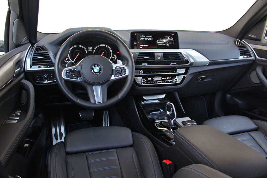 Πλήρως ανασχεδιασμένος είναι και ο θάλαμος επιβατών της νέας BMW X3, με το παραδοσιακά οδηγοκεντρικό ταμπλό. Στο «γρανιτένιο» ταμπλό με τις εξαγωνικές φόρμες υπάρχουν λίγα χειριστήρια προς όφελος της εργονομίας, ενώ κυριαρχεί η μεγάλη οθόνη αφής 10,5 ιντσών και χειρισμό από απόσταση και μέσω του iDrive Controller που διατίθεται στάνταρ. Τα κορυφαίας ποιότητας μαλακά υλικά ντύνουν κάθε σχεδόν επιφάνεια, ενώ σε αντίστοιχα υψηλά επίπεδα βρίσκεται η συναρμογή των διαφόρων επιφανειών και το φινίρισμα. Ο οδηγός κάθεται ψηλά και απολαμβάνει πολύ καλή περιμετρική ορατότητα, θα βρει γρήγορα την κατάλληλη θέση οδήγησης και θα νιώσει αμέσως ότι βρίσκεται σε ένα φρούριο ασφαλείας. Την πληθωρικότητα του εσωτερικού ακολουθούν και οι διαθέσιμοι χώροι, οι οποίοι είναι ιδιαίτερα άνετοι για τις μετακινήσεις έως 5 ενήλικων ατόμων. Το ίδιο ισχύει και για το μεγάλο και πλήρως εκμεταλλεύσιμο πορτ μπαγκάζ των 550 λίτρων.