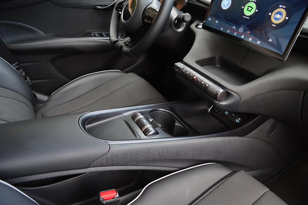 Στην καμπίνα του Dolphin κυριαρχούν οι πολλές καμπύλες στο ταμπλό, οι κυκλικοί αεραγωγοί, η μεγάλη περιστρεφόμενη οθόνη των 12,8 ιντσών και το ανάγλυφο μοτίβο των πλαστικών κάτω-γύρω από αυτή. Ο διάκοσμος σε κερδίζει μονομιάς, κι όχι μόνο λόγω ντιζάιν. Η θήκη για το smartphone στην κεντρική κονσόλα σου λύνει τα χέρια, τα καλοβαλμένα (κι ας είναι σκληρά) πλαστικά αφήνουν τις καλύτερες εντυπώσεις, το ίδιο και η λεπτή επένδυση που καλύπτει ένα μικρό κεντρικό τμήμα, ενώ η εργονομία δεν απαιτεί καθόλου χρόνο εξοικείωσης. Μόνο ο μικρός ψηφιακός πίνακας οργάνων των 5 ιντσών κάπως ενοχλεί, μιας και οι ενδείξεις δεν είναι όσο ευανάγνωστες θα περίμενες, άντε και λίγο τα κουμπιά στο τιμόνι που μοιάζουν ένα «τσακ» πίσω σε ποιότητα από τα υπόλοιπα.