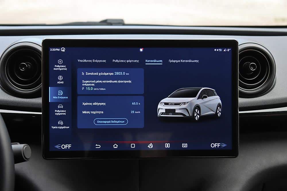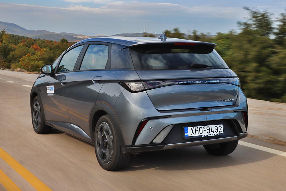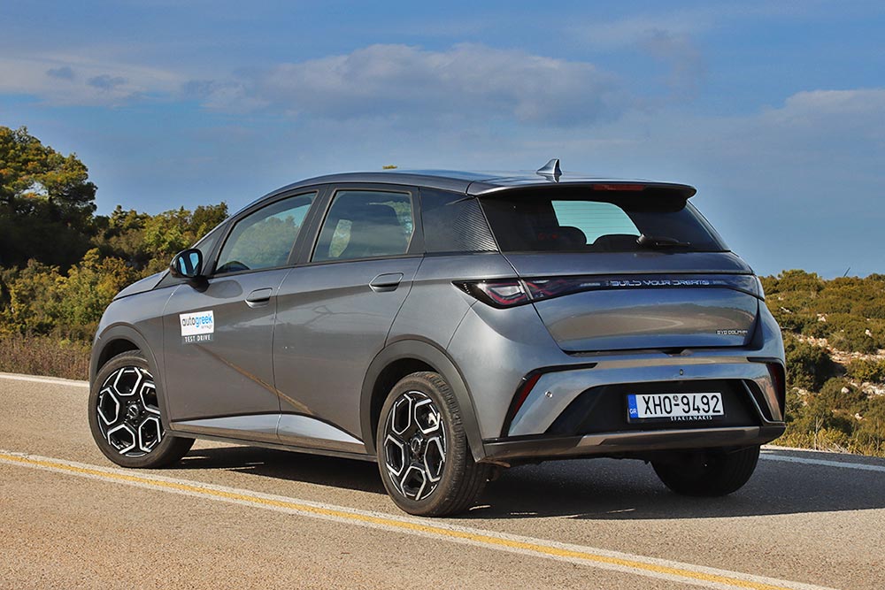 Πρακτικά, τα ανωτέρω μεταφράζονται σε ισχύ 204 ίππων και 310 Nm, εξασφαλίζοντας επιταχύνσεις σπορ αυτοκινήτου και κατανάλωση μικρού ηλεκτρικού. Το «Δελφίνι» ανακοινώνεται στα 7,0 δλ. για το 0-100 χλμ./ώρα, ενώ και οι ενδιάμεσες επιταχύνσεις πραγματοποιούνται ταχύτατα. Αν θέλεις να «παίξεις» μαζί του στα φανάρια, διαπιστώνεις ότι ακόμα και μοτοσικλέτες σεβαστού κυβισμού δυσκολεύονται να μείνουν δίπλα σου στα πρώτα μέτρα. Ο ηλεκτρονικός περιοριστής των 160 χλμ./ώρα συνιστά χαμηλό ταβάνι για το γκάζι του, αλλά δεν χρειάζονται και παραπάνω. Τα 130 χλμ./ώρα στον αυτοκινητόδρομο επιτυγχάνονται/διατηρούνται «σβηστά», με εντυπωσιακά χαμηλές απαιτήσεις σε ενέργεια. Τέτοιοι ρυθμοί πιάνονται χαϊδεύοντας το δεξί πεντάλ, κάτι που μεταφράζεται σε κατανάλωση 14,3-14,8 kWh/100 χλμ. Στην πόλη που κάνει δουλειά και η ανάκτηση ενέργειας (χωρίς λειτουργία one pedal ωστόσο), πέφτει κάτω από τα 13 kWh/100 χλμ. Η μέση τιμή των 15,1 kWh/100 χλμ. είναι εντυπωσιακή για αυτοκίνητο 200+ ίππων, που δεν το λες και ελαφρύ (1.658 κιλά βάρος). Σημειωτέον, η BYD αναφέρει 15,9 kWh/100 χλμ., για να αντιληφθούμε το πόσο λίγο ρεύμα «τραβάει».