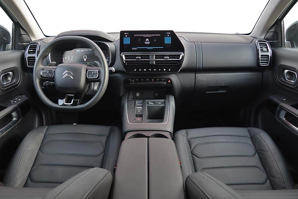 Οι αλλαγές συνεχίζονται και στο εσωτερικό του ανανεωμένου Citroen C5 Aircross, με τις πιο κύριες να εντοπίζονται στην κεντρική κονσόλα και στις νέες επενδύσεις. Στο κέντρο του ταμπλό κυριαρχεί η νέα μεγαλύτερη οθόνη αφής των 10 ιντσών (8 ιντσών στις βασικές εκδόσεις) με την καλή ευκρίνεια, αλλά την κάπως αργή απόκριση στις εντολές. Επιπλέον, ο πλήρως προσαρμόσιμος ψηφιακός πίνακας οργάνων των 12,3 ιντσών, παρέχει όλες τις απαραίτητες πληροφορίες στον οδηγό. Πιο κάτω από το infotainment βρίσκονται χειριστήρια αφής και μπουτόν για διάφορες λειτουργίες του αυτοκινήτου, όπως και ανάμεσα από τα εμπρός καθίσματα. Εκεί, τοποθετήθηκαν τα χειριστήρια του νέου, πιο κομψού και υψηλής τεχνολογίας e-Toggle επιλογέα ταχυτήτων, αντί του λεβιέ που υπήρχε πριν και καταλάμβανε περισσότερο χώρο. Πιο πίσω είναι το κουμπί για το Drive Mode που ενσωματώνει και τη λειτουργία Grip Control (από τη δεύτερη έκδοση Feel Pack με το EAT8) και τα προγράμματα Sport, Normal, Eco, Sand, Mud, Snow, αντί του περιστροφικού χειριστηρίου που υπήρχε πριν.