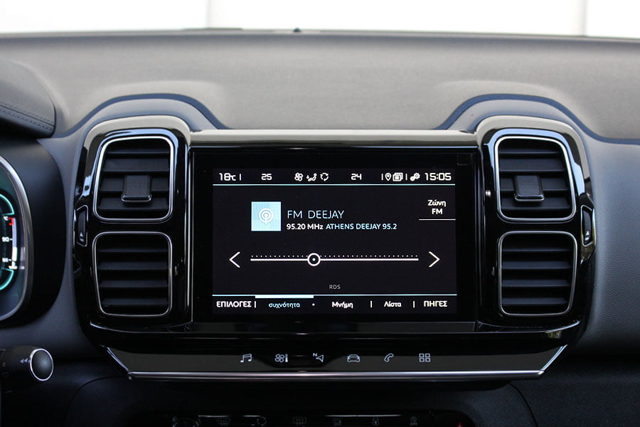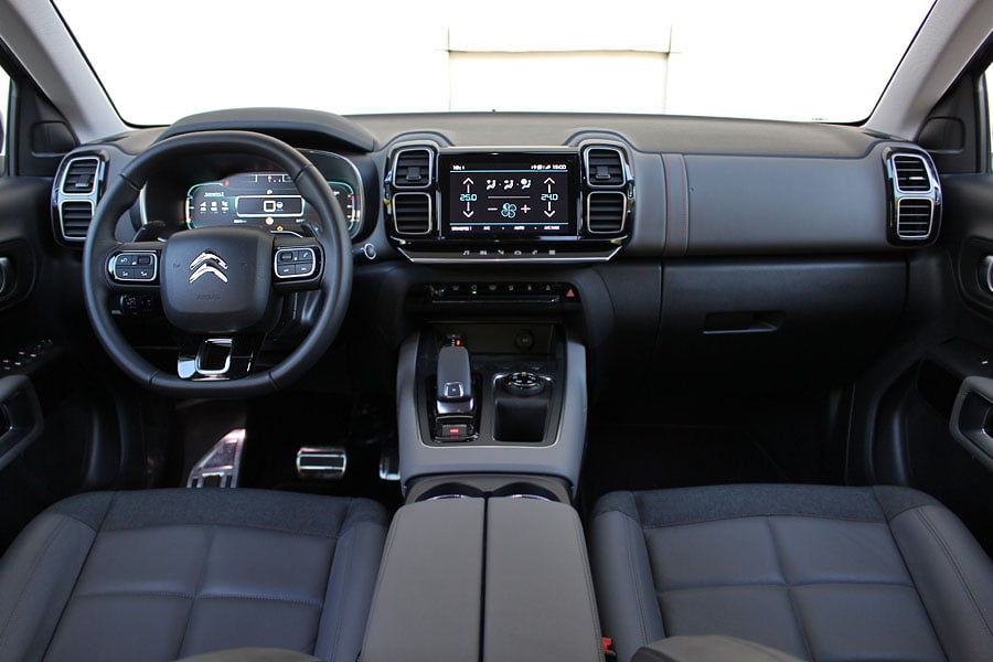 Για το κοινό που δίνει έμφαση στις ανέσεις και στην πρακτικότητα, τότε το C5 Aircross θα τους καλύψει με το παραπάνω. Όπως το αμάξωμα, έτσι και το εσωτερικό διαθέτει μοντέρνο σχεδιασμό, ενώ το αυξημένο του εσωτερικό πλάτος τονίζουν με την σειρά τους οι ευθείες γραμμές και οι επίπεδες επιφάνειες. Επίσης, τα γεωμετρικά σχήματα κυριαρχούν, όπως και οι δύο ψηφιακές οθόνες των 12,3 ιντσών του πίνακα οργάνων και των 8 ιντσών του συστήματος πολυμέσων (δείτε παρακάτω το βίντεο με τις λειτουργίες τους). Σε επίπεδο ποιότητας έχει γίνει χρήση σκληρών πλαστικών στο ταμπλό, όμως η στιβαρή συναρμογή αποτρέπει την εμφάνιση τριγμών, ακόμα και εκτός δρόμου.