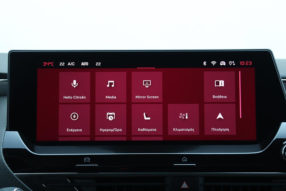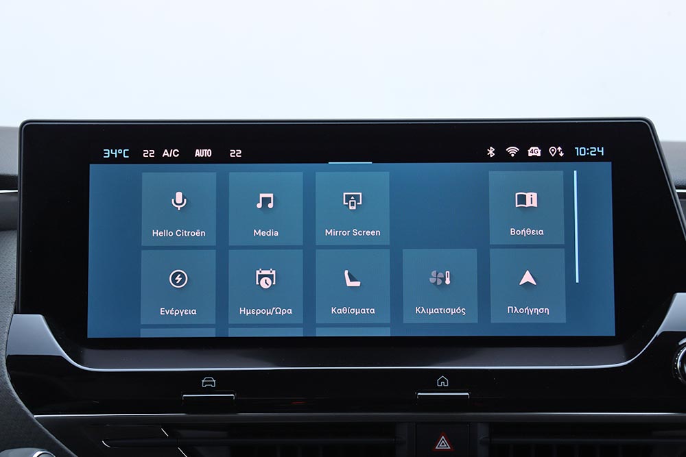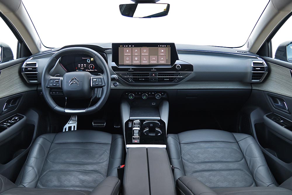 Στο εσωτερικό του Citroen C5 X δεν υπάρχουν εκπλήξεις ή εκκεντρικές λύσεις, αφού δίνεται έμφαση στη μέγιστη άνεση των επιβατών. Το ταμπλό παραπέμπει σε εκείνο του Citroen C4, αλλά με ανώτερο διάκοσμο και ποιότητα, θυμίζοντας περισσότερο μοντέλα της αδελφής πολυτελούς φίρμας DS. Εξάλλου δεν θα πρέπει να ξεχνάμε ότι πρόκειται για το κορυφαίο Citroen, που απευθύνεται σε ένα πολύ «ψαγμένο» και απαιτητικό κοινό. Μαλακά υλικά καλύπτουν πολλές επιφάνειες και συνδυάζονται με όμορφα διακοσμητικά στο ταμπλό και τις πόρτες. Από το premium «σαλόνι» δεν θα μπορούσε να απουσιάζει η απαραίτητη ψηφιακότητα, μέσω της εύκολης στο χειρισμό κεντρικής οθόνης του infotainment των 12 ιντσών και της αρκετά λιτής οθόνης του οδηγού, των 7 ιντσών. Στάνταρ είναι και το σύστημα Extended Head Up Display με διάσταση απεικόνισης 21 ιντσών. Στα θετικά και το γεγονός ότι υπάρχουν φυσικά χειριστήρια για τον έλεγχο του κλιματισμού, ενώ στη βάση της κεντρικής κονσόλας βρίσκονται τα γνώρισμα χειριστήρια για τις επιλογές της μετάδοσης κίνησης και του Drive Mode, μαζί με θήκες.