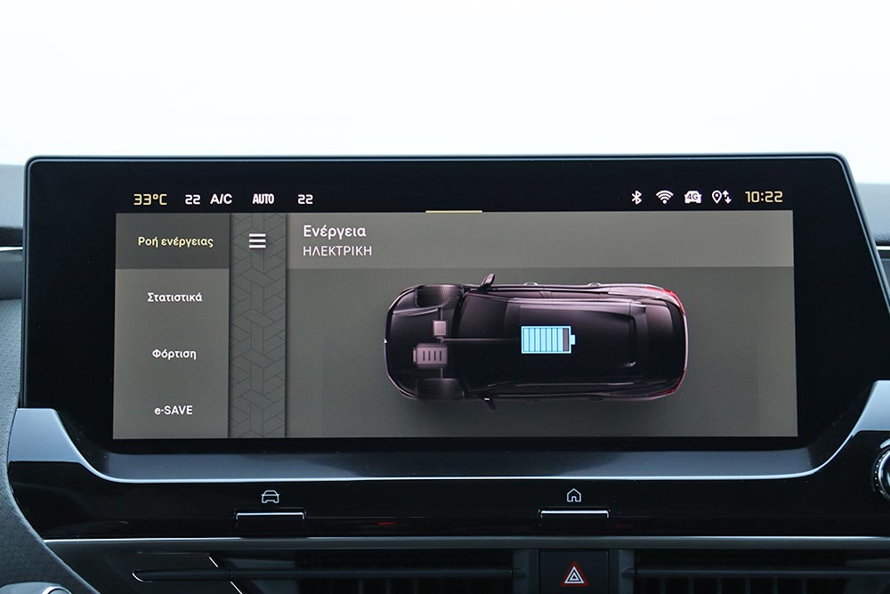 Η τεχνολογία Plug-in Hybrid που συναντάται στο συγκεκριμένο Citroen C5 Χ είναι η κορυφαία της γκάμας, γνωστή από άλλα μοντέλα του ομίλου Stellantis και με τη συνδυαστική ισχύ των 225 ίππων (διατίθεται και με 180 ίππους από 49.800 ευρώ). Αποτελείται από τον 1.6 PureTech των 181 ίππων/300 Nm, τον ηλεκτροκινητήρα των 110 ίππων/320 Nm και την μπαταρία ιόντων λιθίου των 14,2 kWh. Όταν είναι πλήρως φορτισμένη εξασφαλίζει αυτονομία γύρω στα 50 χιλιόμετρα, ενώ με τη χρήση μόνο ρεύματος η μέγιστη ταχύτητα περιορίζεται στα 135 χλμ./ώρα. Για τη φόρτιση σε μια απλή οικιακή πρίζα σούκο 8A απαιτούνται 7 ώρες και 5 λεπτά, ενώ σε Wallbox 16A/32A ο χρόνος πέφτει στις 3 ώρες και 20 λεπτά ή στη 1 ώρα και 40 λεπτά. Όταν αδειάσει η μπαταρία και δεν επαναφορτιστεί, τότε το αυτοκίνητο λειτουργεί σαν full hybrid γιατί ένα ελάχιστο ποσοστό επαναφορτίζει από την επιβράδυνση και την ανάκτηση ενέργειας πέδησης.
