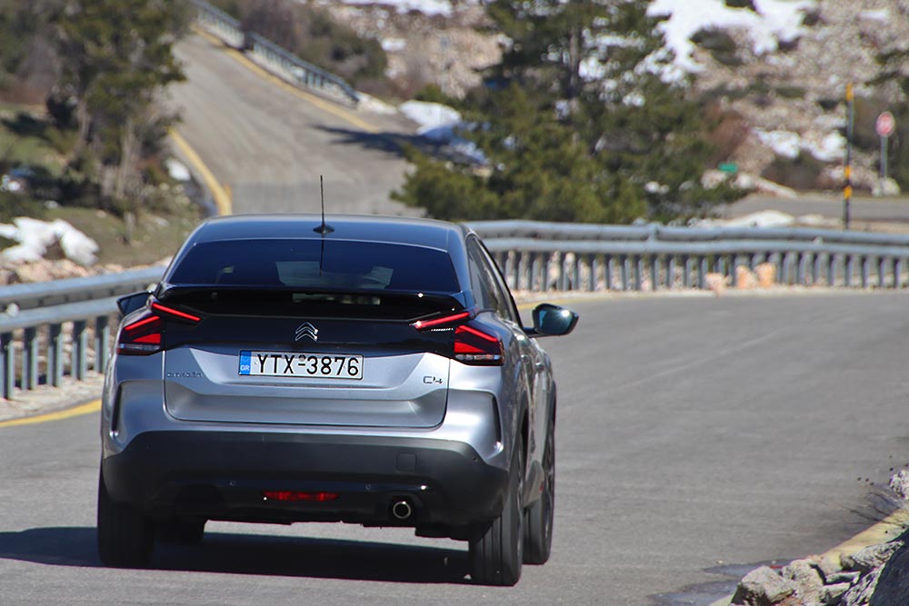 Συνδυαστικά με την πολύ καλή ποιότητα κύλισης θα απολαμβάνετε άνετα και ξεκούραστα ταξίδια στην εθνική οδό και μάλιστα με σβέλτες ταχύτητες στο κοντέρ. Σε αυτό βοηθάει κι η ηχομόνωση η οποία αφήνει εκτός καμπίνας αεροδυναμικούς θορύβους κάνοντάς σας να πατάτε λίγο πιο βαθιά το δεξί πεντάλ. Η καλή εντύπωση από την οδική συμπεριφορά του C-Cross θα συνεχιστεί κι όταν περάσετε στο επαρχιακό δίκτυο. Το ημίψηλο crossover δεν θα σας αρνηθεί την πίεση στις στροφές, από τις οποίες θα περάσει με άνεση, αλλά με ελαφρώς τονισμένες κλίσεις του αμαξώματος. Κάτι άλλωστε απόλυτα φυσιολογικό τόσο λόγω της απόστασης από το έδαφος, όσο και της φιλοσοφίας λειτουργίας της ανάρτησης. Αν θέλετε να στρίψετε, σας προτείνουμε να επιλέξετε το Sport, από τα τρία διαθέσιμα προγράμματα οδήγησης (Eco, Normal & Sport). To Sport κάνει πιο άμεσο το πεντάλ του γκαζιού, που σημαίνει ότι με λίγο «άσε – πάτα» θα σας επιτρέψει να ελέγξετε την υποστροφή, όταν εμφανιστεί υπό πίεση. Αν τώρα το παρακάνετε, το ESP θα πει Stop και θα επαναφέρει την τάξη. Βέβαια ακόμα και στο όριο το Citroen C4 C-Cross είναι αρκετά φιλικό και προβλέψιμο στις αντιδράσεις του, αυξάνοντας το αίσθημα εμπιστοσύνης στο χειριστή του. Τέλος τα φρένα είναι δυνατά, αποτελεσματικά κι ανθεκτικά ακόμα και έπειτα από παρατεταμένη λειτουργία.