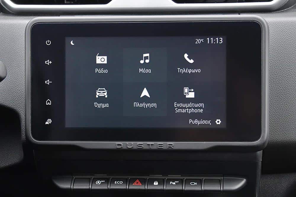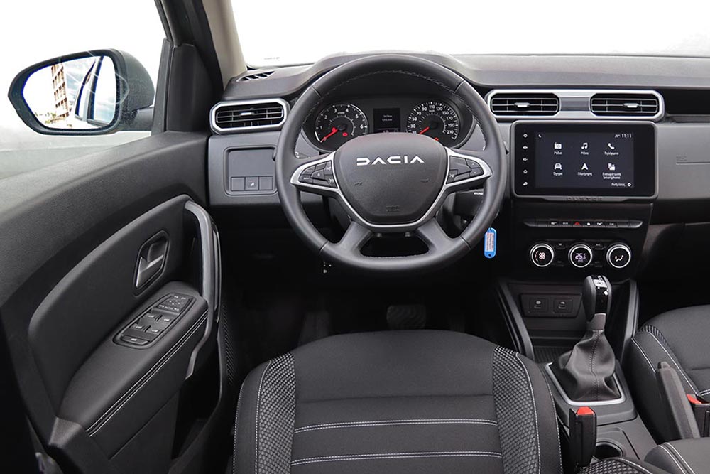 Μικρής έκτασης αλλαγές συναντώνται και στο εσωτερικό του Duster. Αυτές αφορούν το νέο λογότυπο της μάρκας στο τιμόνι και τους παραλληλόγραμμους αεραγωγούς, αντί των στρογγυλών που υπήρχαν ανέκαθεν στο Duster. Κατά τα λοιπά, ο θάλαμος των επιβατών του ρουμάνικου SUV με τις γαλλικές καταβολές παρέμεινε ως είχε. Στην κεντρική κονσόλα φιλοξενείται η εύχρηστη, απλή και ευανάγνωστη οθόνη των 8 ιντσών, χωρίς πολλά μενού -υπομενού και ένα σωρό, περιττά πολλές φορές εικονίδια. Ο οδηγός κάθεται ψηλά στο αναπαυτικό κάθισμα και βρίσκει εύκολα την κατάλληλη θέση, όμως θα ήταν επιθυμητή λίγο καλύτερη πλευρική στήριξη. Τα διάφορα χειριστήρια προσφέρουν πολύ καλή εργονομία και είναι εκεί που πρέπει, ενώ και ο πίνακας οργάνων με το αναλογικό στροφόμετρο και ταχύμετρο μαζί με την οθόνη του trip computer στο κέντρο είναι απλά και κλασικά.