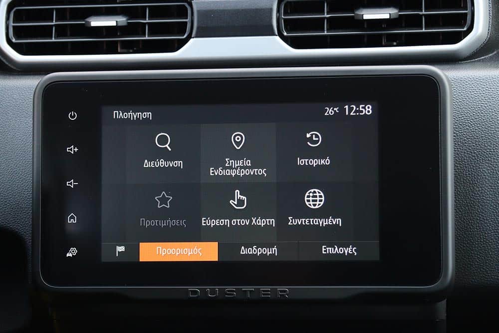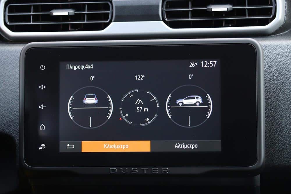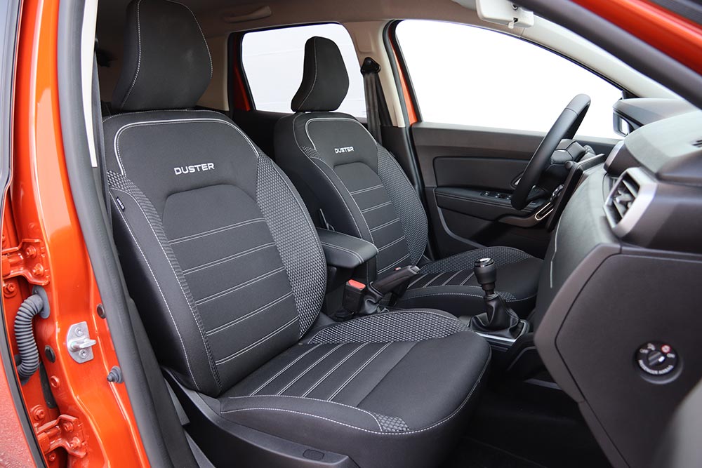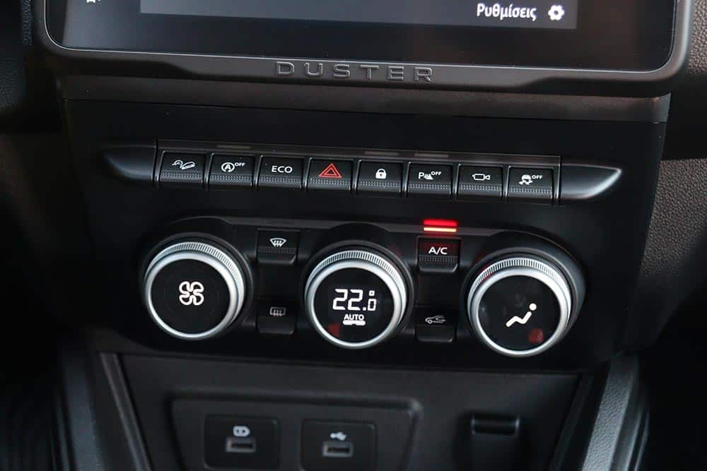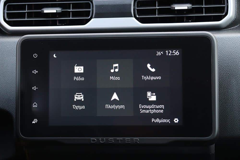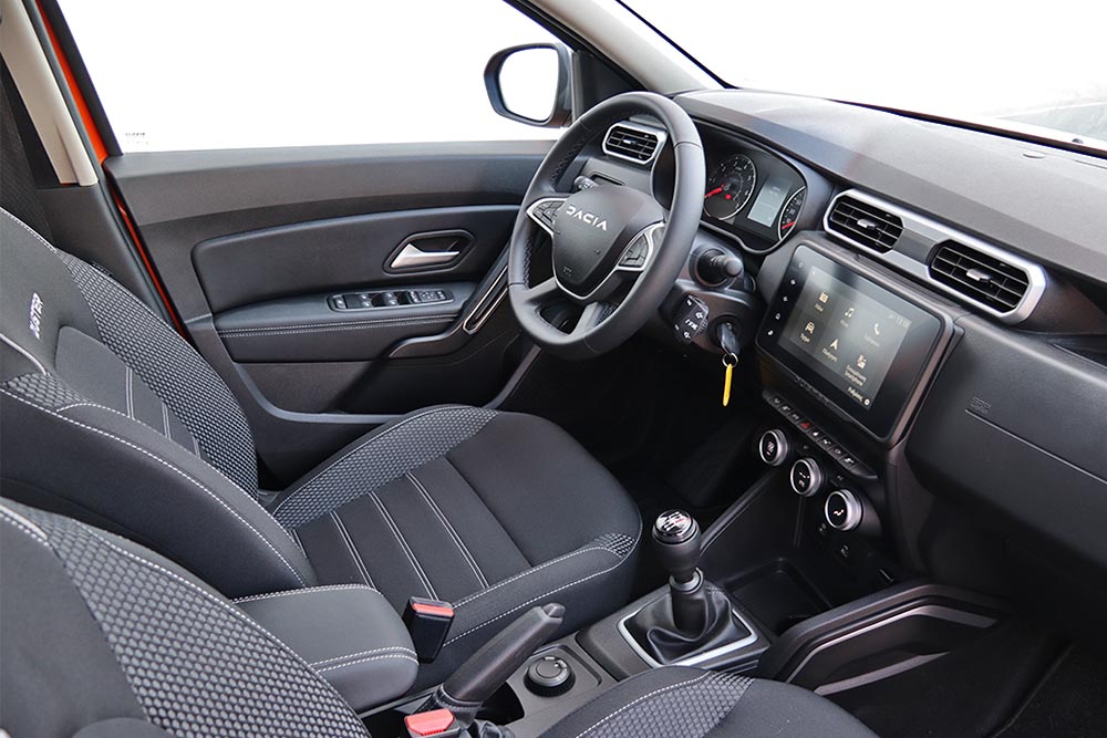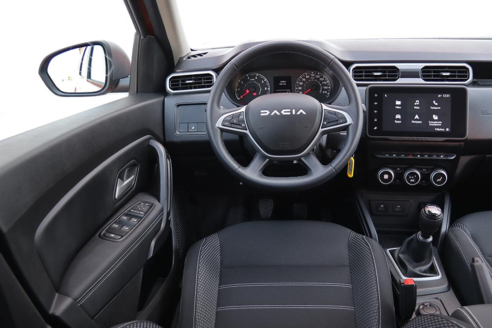 Μετά την ανανέωση που δέχτηκε το Dacia Duster, έγιναν κάποιες μικρές αναβαθμίσεις και στο εσωτερικό του. Αυτές εστιάζονται στο νέο λογότυπο «DACIA» στο τιμόνι και τους παραλληλόγραμμους αεραγωγούς που ταιριάζουν με τις οριζόντιες γραμμές του ταμπλό και αντικατέστησαν τους στρογγυλούς. Στο κέντρο του ταμπλό κυριαρχεί η απλή και εύχρηστη οθόνη αφής των 8 ιντσών, χωρίς δεκάδες μενού – υπομενού και με τον οδηγό να ψάχνεται. Από πλευράς ποιότητας τα σκληρά πλαστικά με τη γεροδεμένη συναρμογή ικανοποιούν σε όψη και υφή στις φθηνότερες εκδόσεις, αλλά όχι στις πιο ακριβές των π.χ. 30.000 ευρώ.
