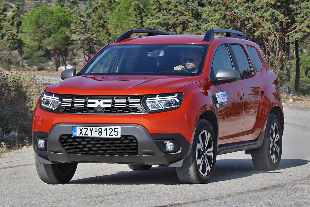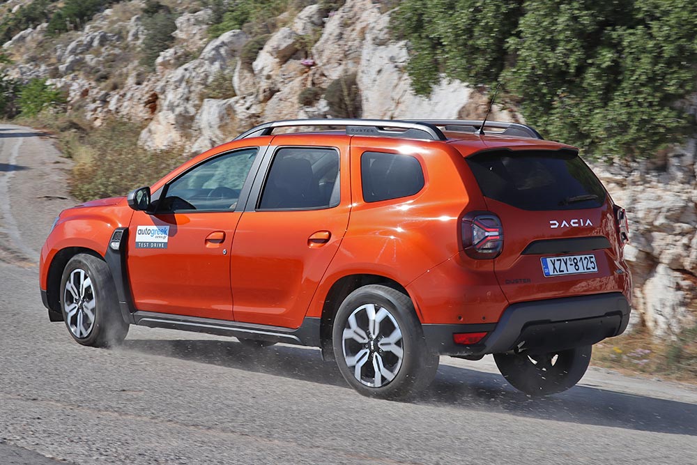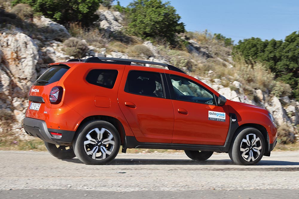 Οι τεχνικοί της Dacia έχουν καταφέρει παράλληλα να περιορίσουν τις κλίσεις στις στροφές, όπου το Duster κρατάει πολύ καλά τη θέση του. Τα ελαστικά παρέχουν επαρκέστατη πρόσφυση, ενώ υπό πίεση το αυτοκίνητο θα αρχίσει να γλιστρά προοδευτικά και με την πίσω κίνηση να εμπλέκεται άμεσα (στην επιλογή Auto) όταν οι εμπρός τροχοί αρχίσουν να ολισθαίνουν. Το τιμόνι μεταφέρει τεχνητή αίσθηση, με το βάρος να αυξομειώνεται κομμάτι απότομα αναλόγως ταχύτητας, όντας παράλληλα και λίγο αργό. Βέβαια το Duster δεν φτιάχτηκε για γρήγορες ασφάλτινες αναβάσεις, αλλά για να πηγαίνει και σε κακοτράχαλες και δύσβατες εκτός δρόμου διαδρομές.