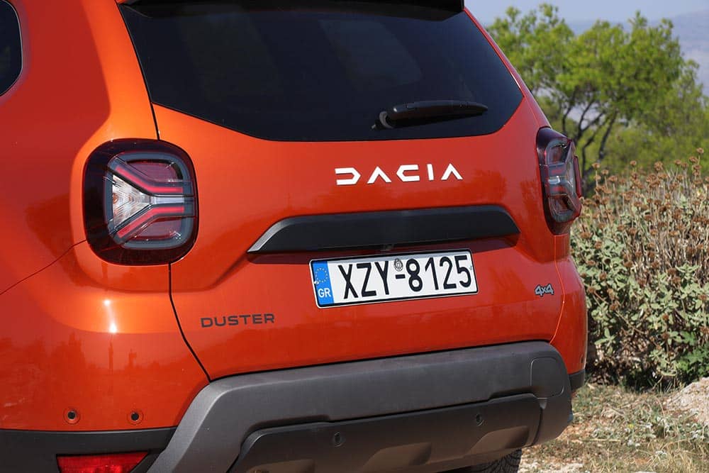 Το ανανεωμένο Duster, όπως και όλα τα μοντέλα της Dacia, ξεχωρίζουν αμέσως εξωτερικά από τη νέα μάσκα και σήματα. Μπροστά διακρίνεται το νέο λογότυπο «DC» στο κέντρο με τις λεπτές οριζόντιες γραμμές εκατέρωθεν, που εναρμονίζονται με τα δυναμικού σχεδιασμού φωτιστικά σώματα. Το «DC» συναντάται και στο κέντρο των ζαντών, ενώ πίσω κυριαρχεί το «DACIA» ολογράφως, σε γραμματοσειρά ανάλογη του μονογράμματος. Πολύ πιο διακριτικά είναι τα απλά αυτοκόλλητα με τα λογότυπα «DUSTER» και «4×4». Συνολικά το Duster παρουσιάζει ελκυστικό σχεδιασμό με μυώδη και εκτός δρόμου χαρακτηριστικά, δείχνοντας πιο μεγάλο από τα 4.341 χιλιοστά που μετρά σε μήκος.