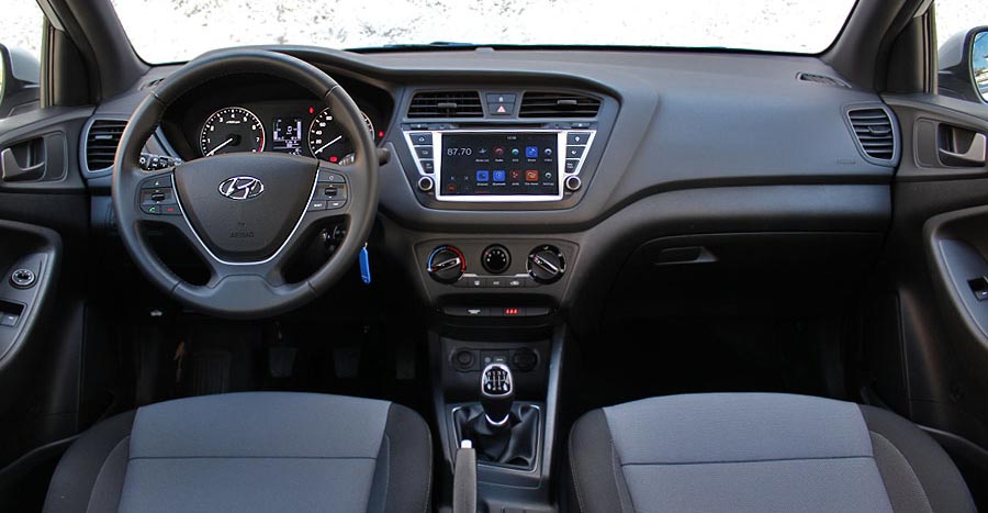 Κοιτώντας το εσωτερικό του Hyundai i20 θα δεις μία σχεδίαση χαμηλών τόνων, η οποία δίνει προτεραιότητα στην χρηστικότητα και την εργονομία. Κάτι που θα καταλάβεις και θα εκτιμήσεις στην καθημερινή συμβίωση με το αυτοκίνητο. Καθόλου φλύαρο και κυρίως ουσιαστικό, το ταμπλό του i20 έχει στο κέντρο του την οθόνη αφής, με καλή ευκρίνεια και απόκριση στο άγγιγμα. Πιο κάτω είναι το πάνελ των χειριστηρίων για τον κλιματισμό. Τα υλικά που έχουν χρησιμοποιηθεί είναι ποιοτικά με λεπτό μαλακό πλαστικό σε ένα μεγάλος μέρος του ταμπλό, ενώ ακόμη και οι σκληρές επιφάνειες είναι ευχάριστες στην όψη. Ο αναλογικός πίνακας οργάνων είναι ευανάγνωστος, το τιμόνι έχει χειριστήρια και δύσκολα θα σε αναγκάσει να πάρεις τα χέρια του από αυτό, ενώ θήκες μικροαντικειμένων υπάρχουν διάσπαρτες στην καμπίνα και είναι ευρύχωρες. Το ντουλαπάκι του συνοδηγού είναι κλιματιζόμενο, ο χώρος για τους επιβάτες είναι άνω του μέσου όρου και ο χώρος αποσκευών είναι μεγάλος στα 326 λίτρα (κιτ επισκευής ελαστικού και όχι ρεζέρβα).