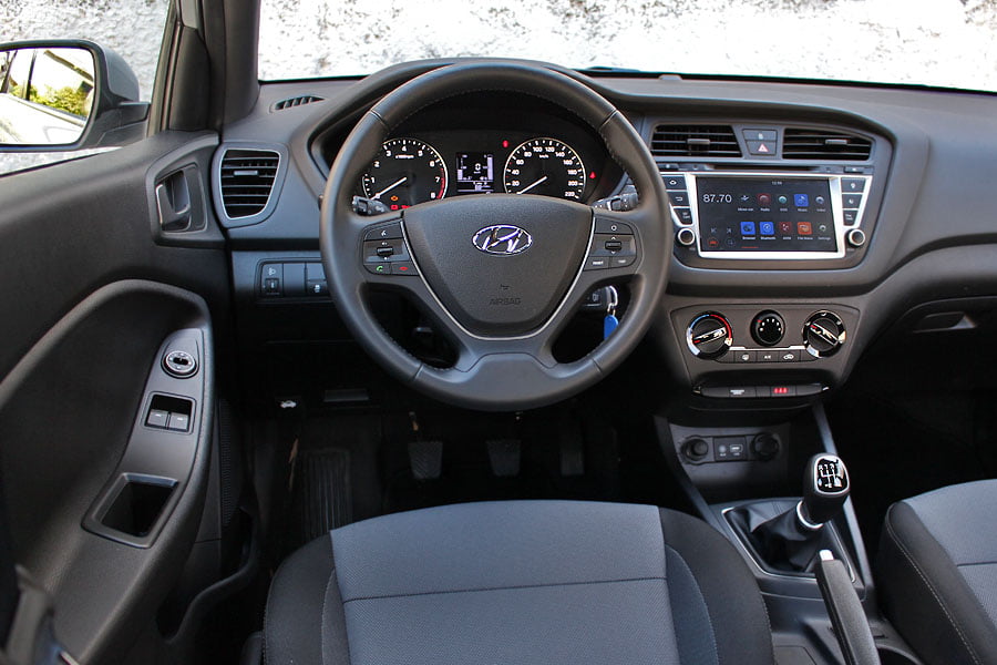 Κοιτώντας το εσωτερικό του Hyundai i20 θα δεις μία σχεδίαση χαμηλών τόνων, η οποία δίνει προτεραιότητα στην χρηστικότητα και την εργονομία. Κάτι που θα καταλάβεις και θα εκτιμήσεις στην καθημερινή συμβίωση με το αυτοκίνητο. Καθόλου φλύαρο και κυρίως ουσιαστικό, το ταμπλό του i20 έχει στο κέντρο του την οθόνη αφής, με καλή ευκρίνεια και απόκριση στο άγγιγμα. Πιο κάτω είναι το πάνελ των χειριστηρίων για τον κλιματισμό. Τα υλικά που έχουν χρησιμοποιηθεί είναι ποιοτικά με λεπτό μαλακό πλαστικό σε ένα μεγάλος μέρος του ταμπλό, ενώ ακόμη και οι σκληρές επιφάνειες είναι ευχάριστες στην όψη. Ο αναλογικός πίνακας οργάνων είναι ευανάγνωστος, το τιμόνι έχει χειριστήρια και δύσκολα θα σε αναγκάσει να πάρεις τα χέρια του από αυτό, ενώ θήκες μικροαντικειμένων υπάρχουν διάσπαρτες στην καμπίνα και είναι ευρύχωρες. Το ντουλαπάκι του συνοδηγού είναι κλιματιζόμενο, ο χώρος για τους επιβάτες είναι άνω του μέσου όρου και ο χώρος αποσκευών είναι μεγάλος στα 326 λίτρα (κιτ επισκευής ελαστικού και όχι ρεζέρβα).