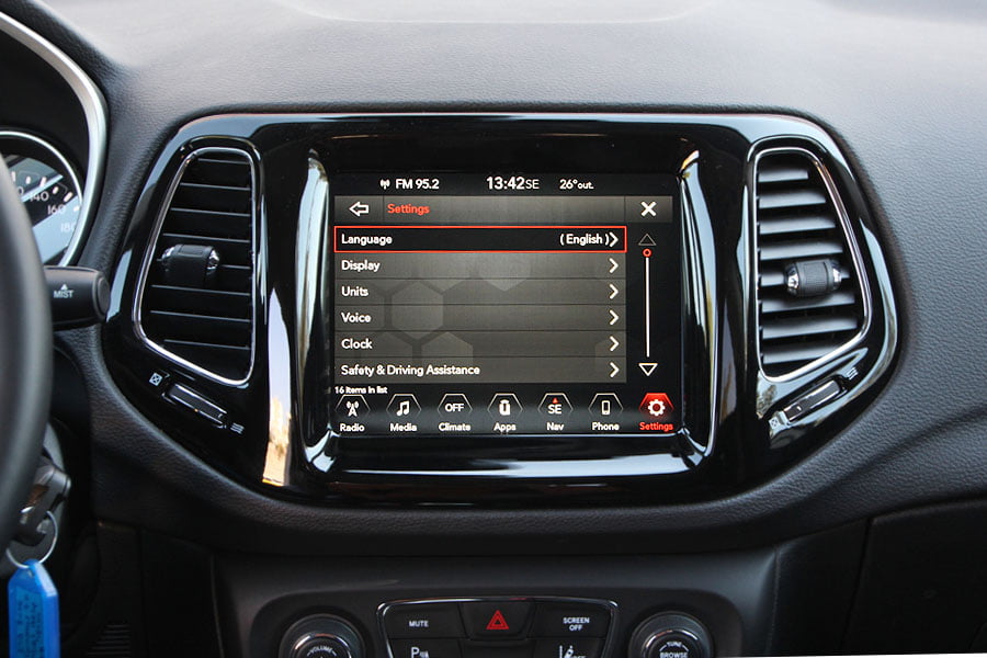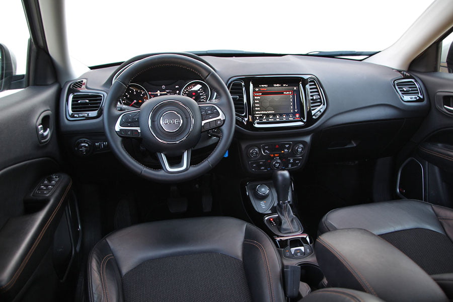 Αυτή την φορά η Jeep άλλαξε προσέγγιση στον τρόπο σχεδιασμού της καμπίνας και του ταμπλό, λαμβάνοντας υπόψη τα ευρωπαϊκά θέλω. Έτσι, το εσωτερικό του νέου Jeep Compass, σε καμία περίπτωση δεν θυμίζει σχεδιαστικά και ποιοτικά (ευτυχώς), αυτό της προηγούμενης γενιάς, με τις χοντροκομμένες επιφάνειες και τα σκληρά πλαστικά. Τα υλικά είναι ποιοτικά και η συναρμολόγησή τους σε πείθει, ενώ όπου και αν κοιτάξεις η προσοχή στην λεπτομέρεια είναι έκδηλη. Εργονομικά χρειάζεται ένα διάστημα εξοικείωσης, καθώς το τιμόνι με τους πολλούς διακόπτες, ακόμη και στο πίσω μέρος του, ίσως δυσκολέψει κάποιους, ενώ η έγχρωμη οθόνη αφής θέλει μία εξοικείωση. Πρέπει όμως να τονίσουμε πως όλοι οι κύριοι διακόπτες και τα χειριστήρια είναι σε επίκαιρες θέσεις. Από την άλλη, οι χώροι είναι σε καλό επίπεδο, κάτι στο οποίο φυσικά βοηθούν οι εξωτερικές διαστάσεις του αυτοκινήτου αλλά και το μεταξόνιο, που εξασφαλίζει αρκετό χώρο για τους πίσω επιβάτες. Όσον αφορά στον χώρο αποσκευών, αυτός είναι στα 438 λτ.